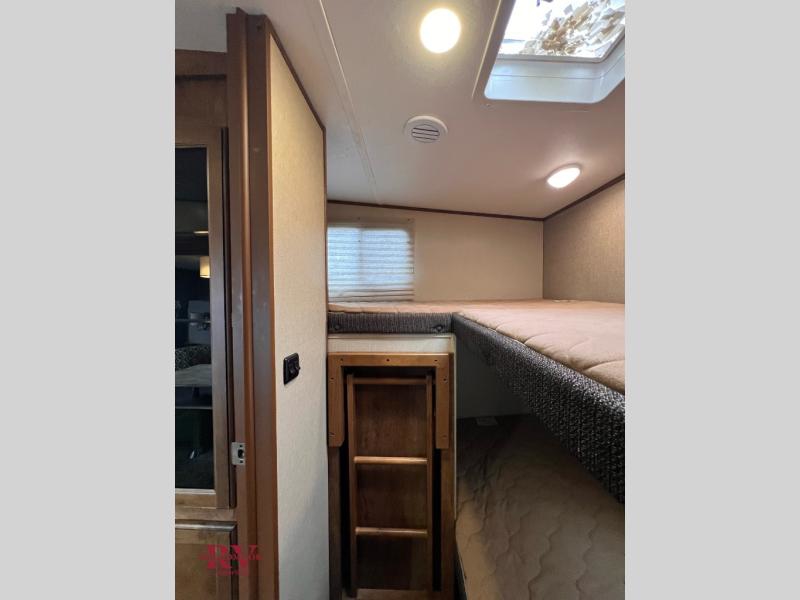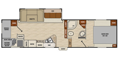Just outside the bath you will find a hall door that leads into the master bedroom which includes a comfortable queen size bed with overhead storage, a nightstand, and a bedside wardrobe. You will also find plenty of clothing storage in the slide out wardrobe/linen that provides more floor space to move around.