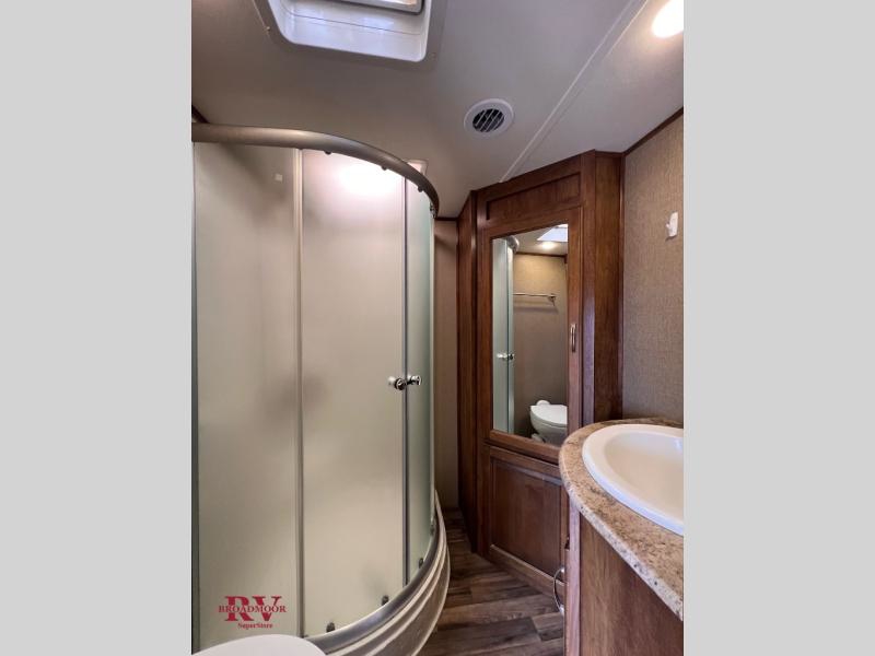 Head up the steps to a complete bath found on your left. Inside there is a toilet, sink with overhead cabinet, corner 34" x 34" shower, plus access to the slide out linen cabinet that is part of the bedroom wardrobe slide. This is accessible due to the second bath entry door that leads into the front master.