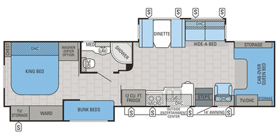 There are plenty of overhead cabinets inside the motor home, as well as exterior storage compartments. The 14' awning and outside entertainment center will become your favorite spot outdoors, plus there so much to enjoy inside and out!