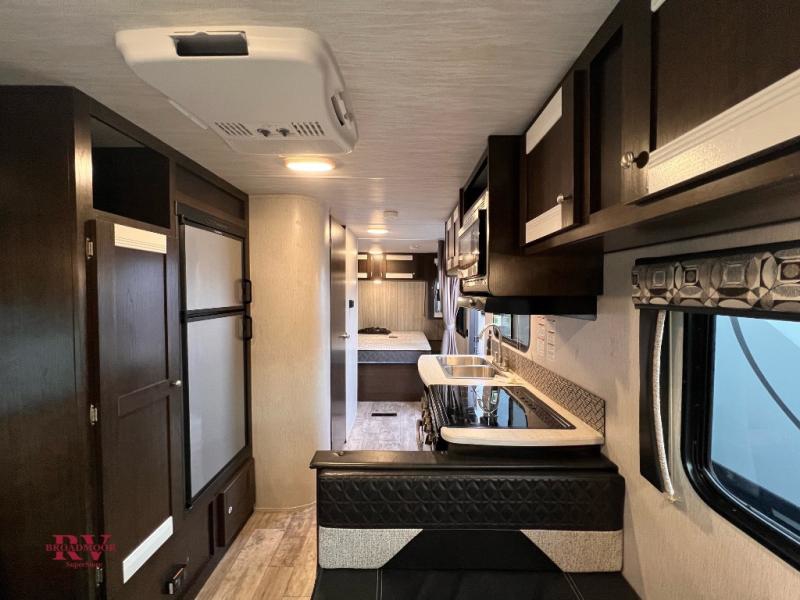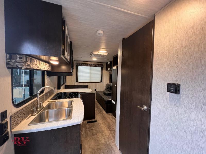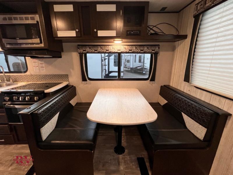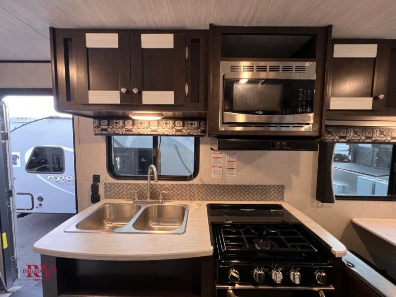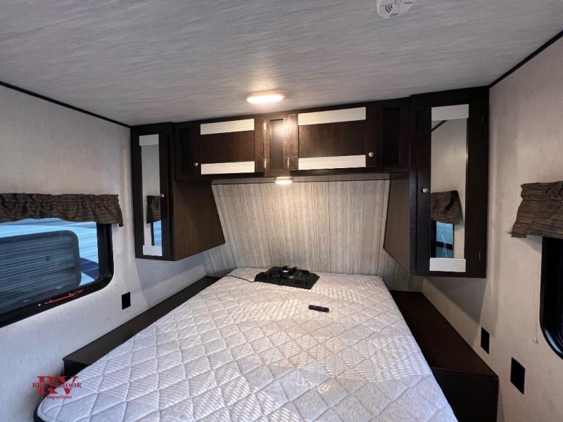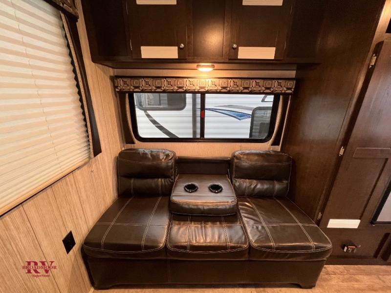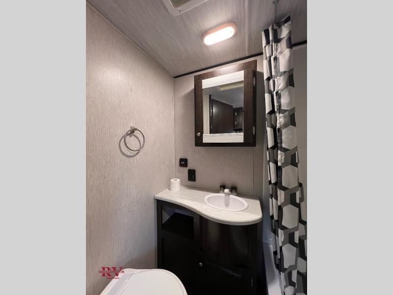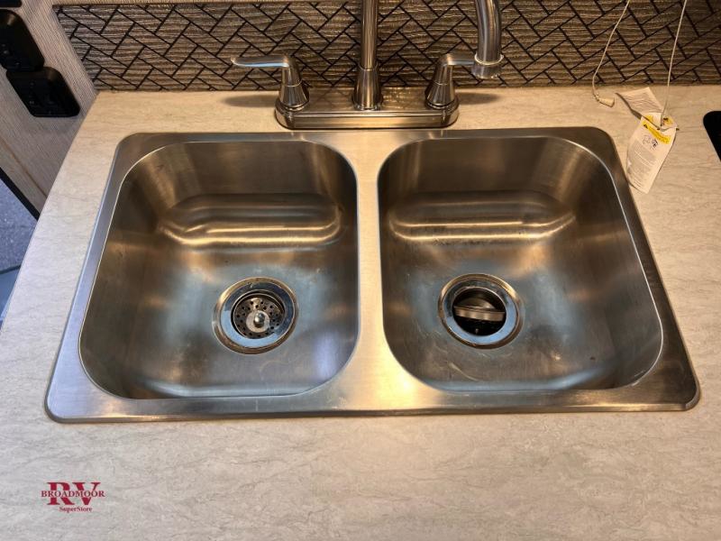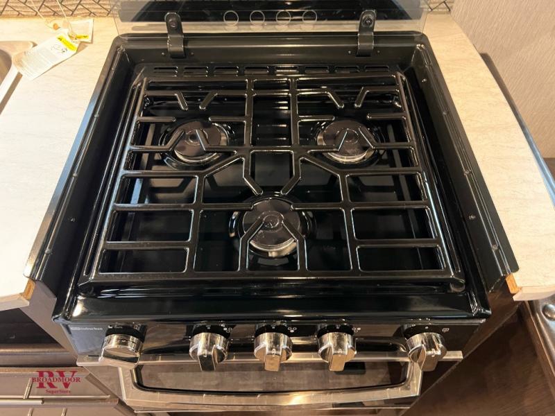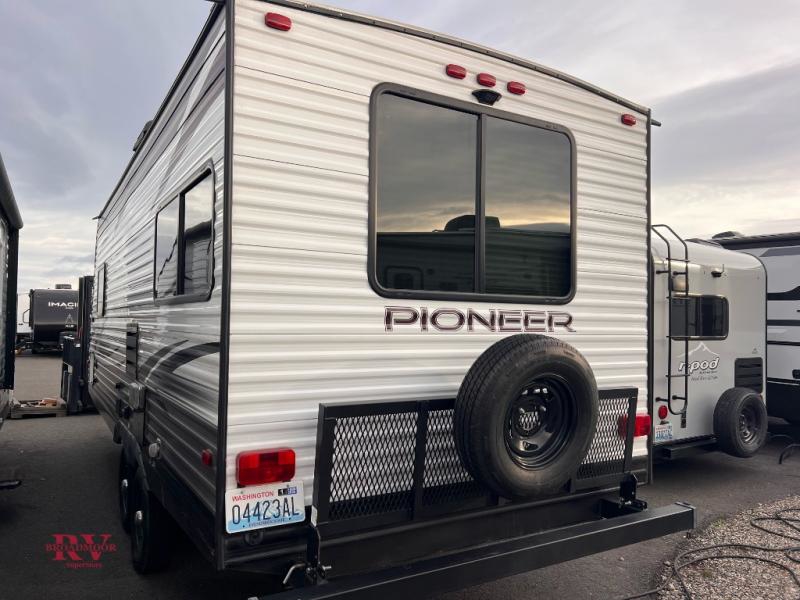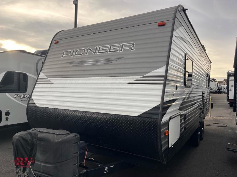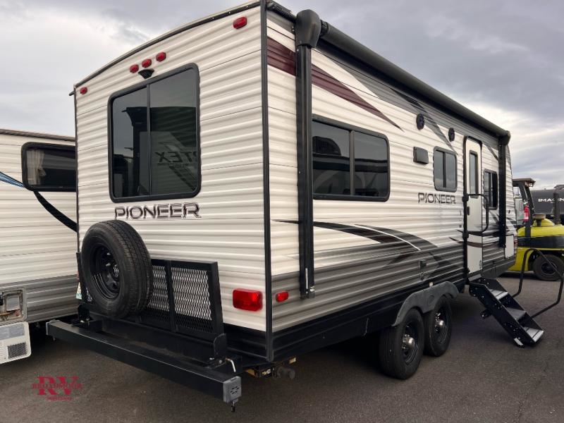 You will be able to hit the road at a moment's notice with this Pioneer travel trailer in tow. A residential sink, three-burner range, microwave, and double-door refrigerator complete the kitchen and give you the perfect place to whip up a hearty meal after a long day of working up an appetite outdoors. When the sun has faded, you will look forward to grabbing a few lawn chairs, sitting down underneath the 14' power awning, and listening to your favorite music play softly on the exterior speakers.
