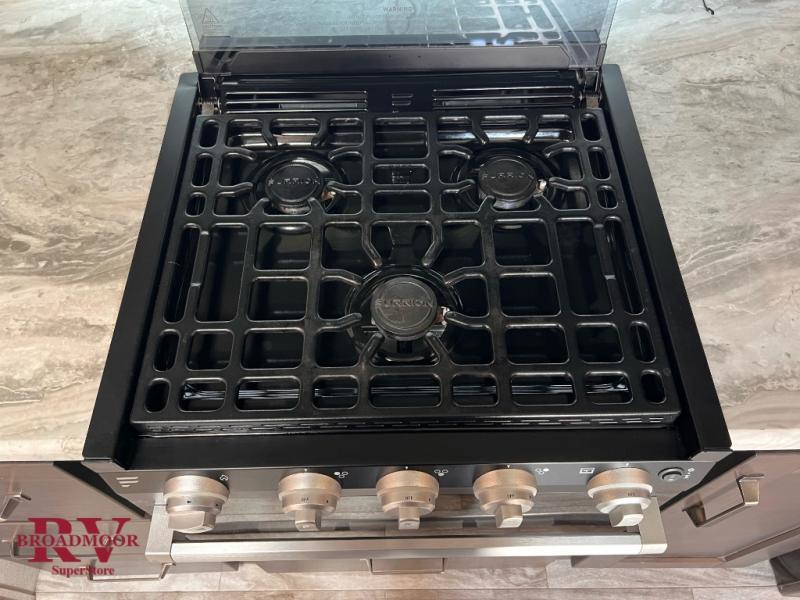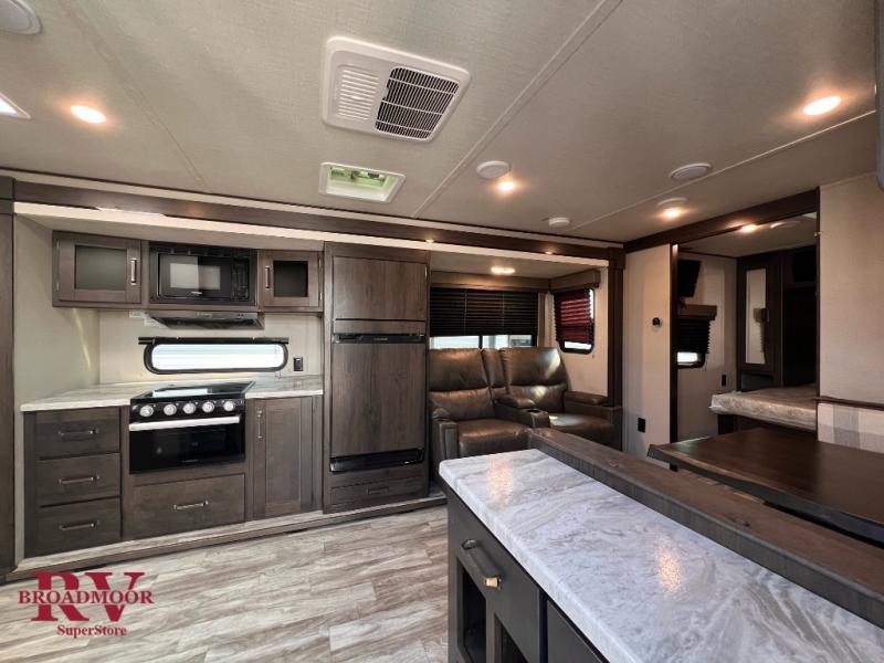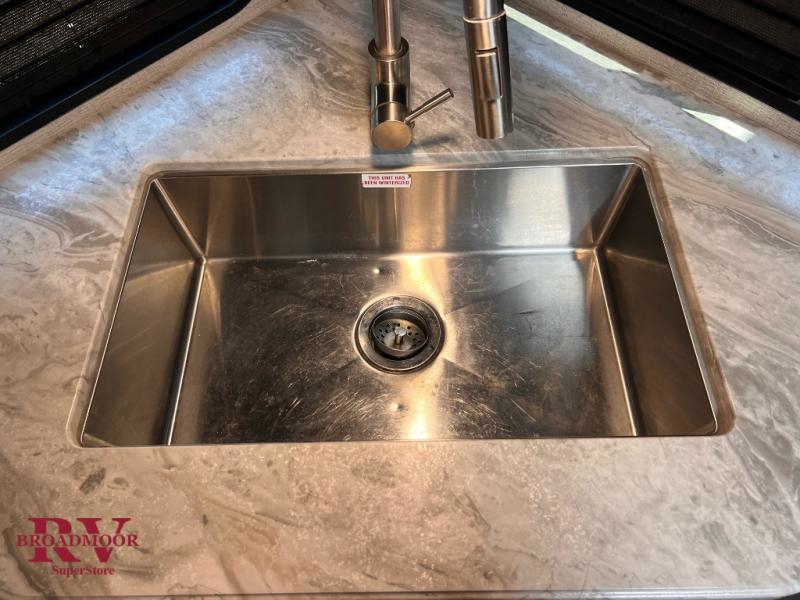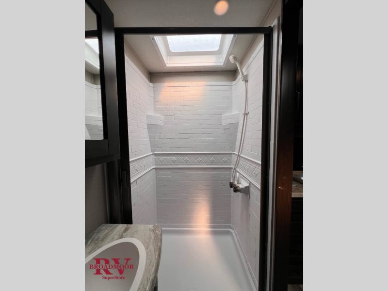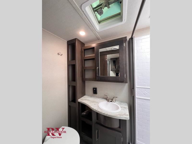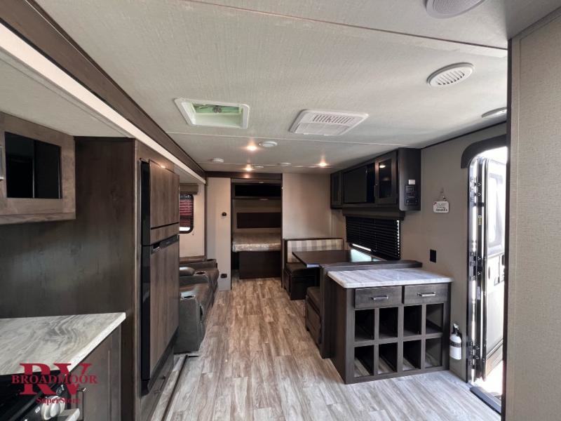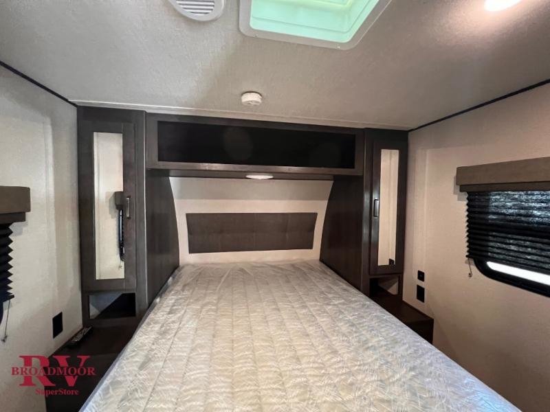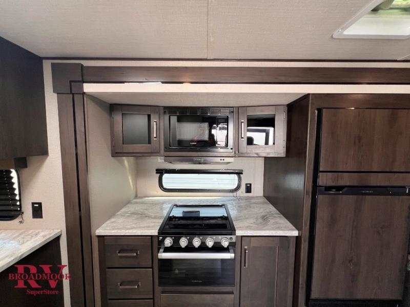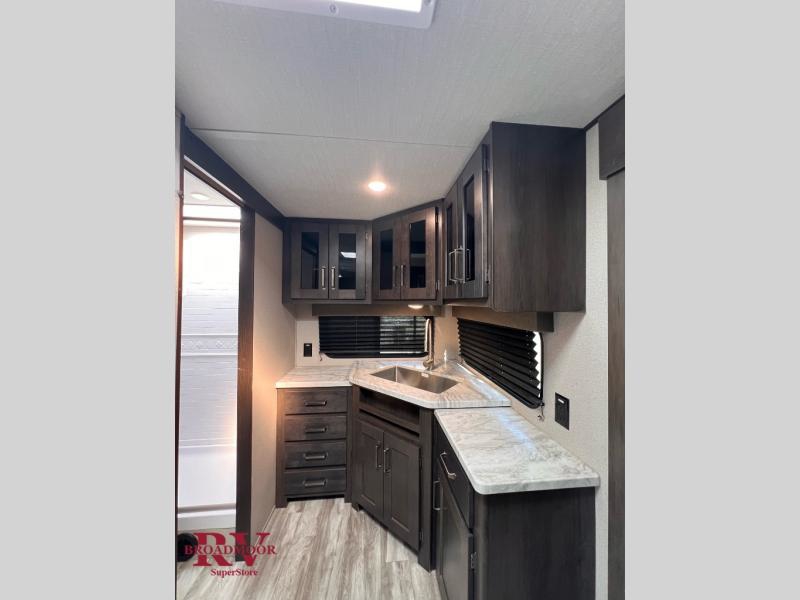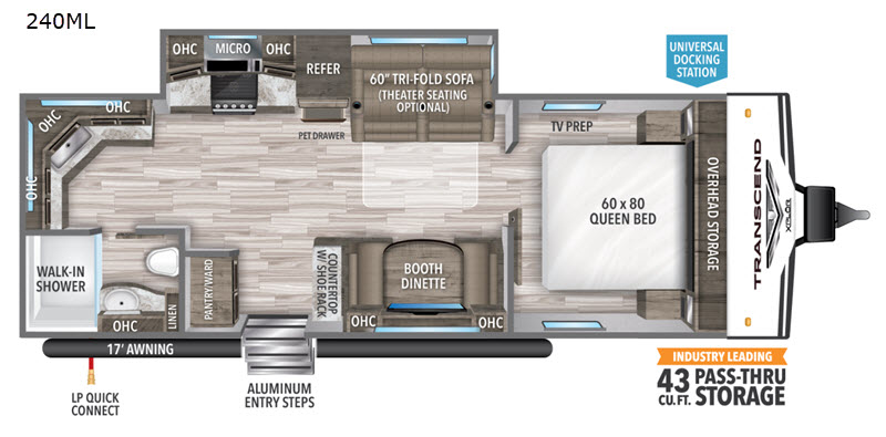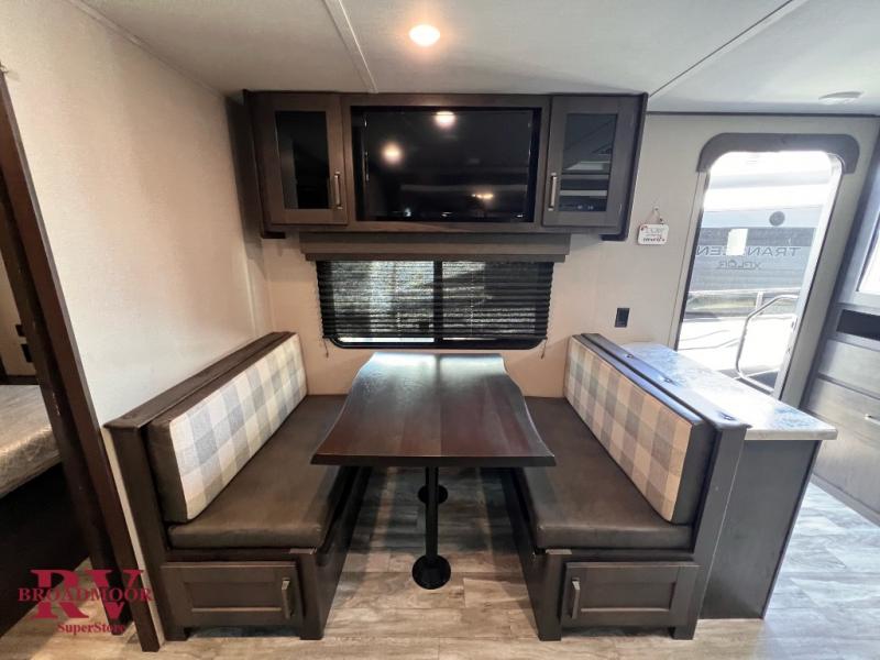 You will enjoy a good night's rest each night in this Transcend Xplor travel trailer with a queen-size bed in the front private bedroom, plus there is an area prepped for you to add a TV. The 60" tri-fold sofa is not only a good place to take an afternoon nap, but it is also a place to sleep for extra guests once converted. While you are enjoying your delicious meal at the booth dinette, your furry friend can enjoy theirs at the pull-out pet drawer below the double-door refrigerator. As you enter the unit, you will see a countertop with a shoe rack to your right and a wardrobe/pantry to your left. The rear corner bathroom has a walk-in shower for you to start each day feeling clean and fresh too!
