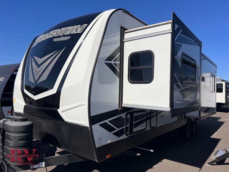 Just imagine you are unloading your toys at your favorite destination from 16' 6" of cargo space in this Momentum G-Class toy hauler. The chef of the family will love having the option to cook indoors or outdoors at the outside kitchen that includes an exterior refrigerator for cold drinks. You will have three sofas and two Euro chairs to relax on as well as a Happi-Jac power bunk and a queen bed when it's time to sleep. Don't leave any momentum behind! Check it out today!