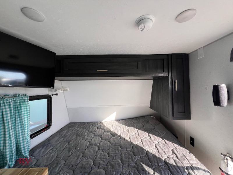 If you crave adventure, this Ozark travel trailer is ready to help you get your next fix! From the RV queen bed at the front to the double-size bunks in the back, you'll have comfortable sleeping accommodations for you and your fellow adventure junkies. You can also find space for one more tired camper on the bench dinette. The full bathroom comes equipped with a shower, foot-flush toilet, and sink to help you clean up after you spent all day playing in the dirt. The kitchen will also be a big help after you've exerted all of your energy because it will provide you with a hearty meal when you use the two-burner cooktop to create something delicious. The 11-cubic foot refrigerator is useful for keeping drinks cold, and the microwave will let you heat up something fast.