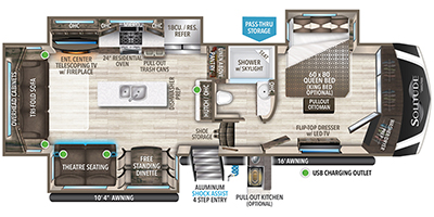 Traveling for long periods at a time is made easy with this gourmet kitchen that can feed your entire group a holiday meal! The professional-grade stainless steel cooktop with a built-in 24" residential oven, microwave, 12V 20 cu. ft. refrigerator, and a kitchen island offers everything you will need to enjoy cooking for your family and guests. There is abundant storage throughout multiple overhead cabinets, a kitchen pantry and hutch, show storage under the interior steps, a bath linen cabinet for your towels, and in the front master bedroom which features a large closet. In the bedroom there is also a queen bed on a slide for added space to sleep comfortable at night, or you may choose an optional king bed if you enjoy more space. You will also find a closet prepped for an optional washer/dryer, large wardrobe, plus a flip-top dresser with an LED TV above. In the bathroom, enjoy a hot shower with a flip-up teak seat and overhead skylight, plus a vanity with sink. Two nice awnings will provide outdoor living space keeping you protected from the sun and rain, and you can add an optional pull-out kitchen to enjoy convenient cooking outdoors as well.