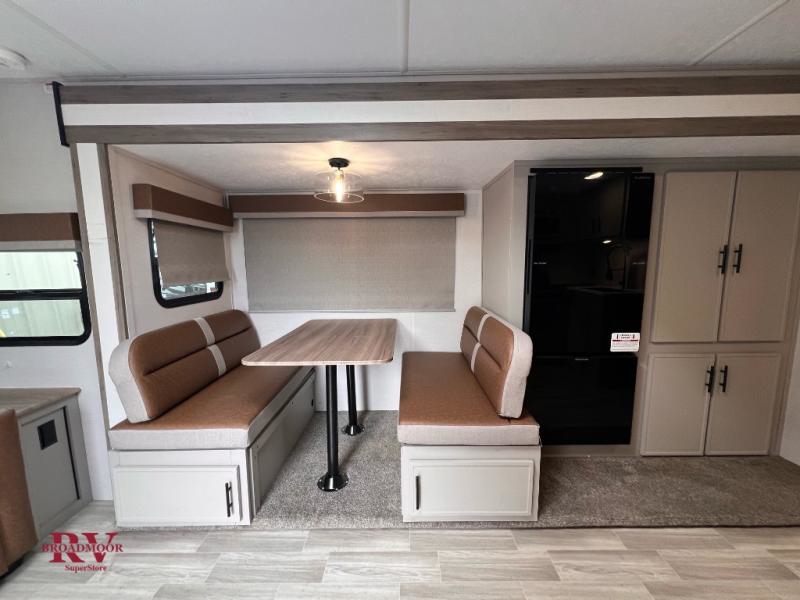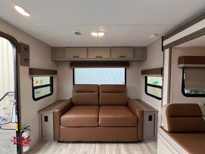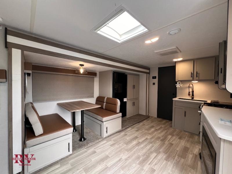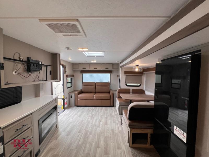 Pack your bags and head for the lake with this spacious travel trailer in tow! The rear living area is inviting with its sofa and end tables, skylight, plus an entertainment center for movie nights. You'll also find a booth dinette, oversized refrigerator, and pantry within a large slide out for more space, and the full kitchen will let you cook meals each day. This model includes a spacious walk-through bath that leads to the front master bedroom where you'll sleep soundly on the queen bed. There is also a large wardrobe, a nightstand that is USB/CPAP ready, and underbed storage for shoes, luggage, and more. Outside, the 20' power awning will provide you with shade, and the outdoor grill will be perfect for burgers!