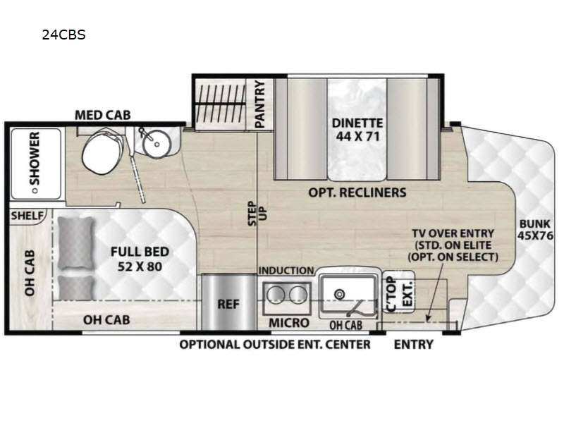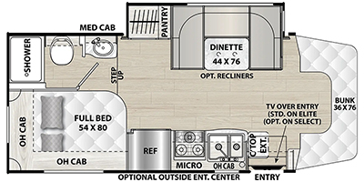You will find comfort, convenience, and affordability in this Prism Select Class C diesel motorhome! The kitchen is stocked with a three-burner range, double sink, refrigerator, countertop extension, and a pantry so that you can eat your favorite meals no matter where you are. You can also enjoy those meals at the dinette. Sleeping space is easy to find in this coach because there is a full-size bed and a bunk above the cab, and the dinette can also provide sleeping space once it's folded into position. This coach gives you the opportunity to customize as you wish because it comes with a couple of options, like the optional recliners in place of the dinette, an optional TV above the entry door, and the optional outside entertainment center as well.