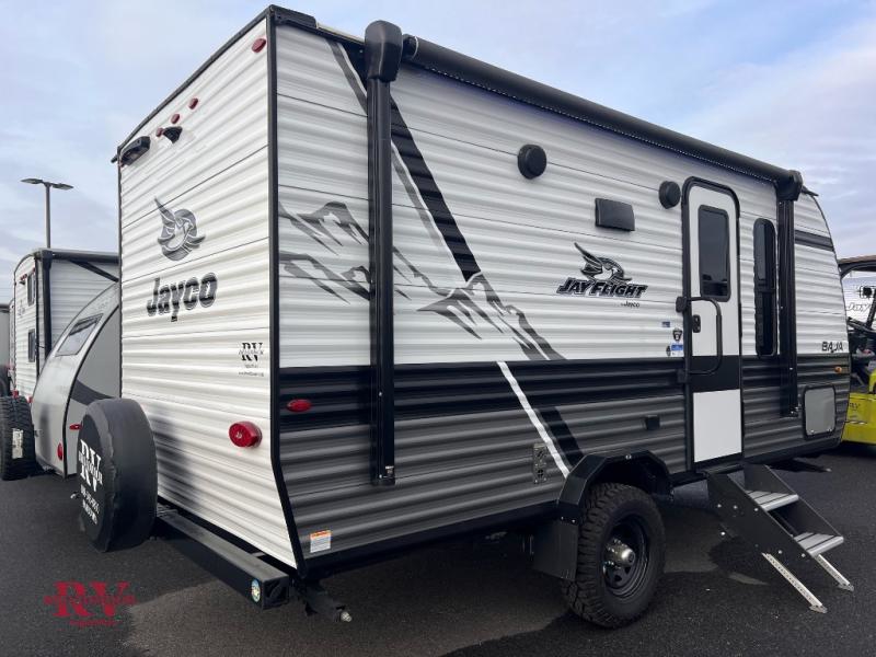 The Jayco Jay Flight SLX travel trailer is quite easy to own because it is lightweight, and it comes with a single axle. Built on a fully integrated A-frame with galvanized-steel, impact-resistant wheel wells, the Jay Flight SLX has quality at its very foundation. That quality continues on to the electric self-adjusting brakes, easy-lube hubs, Magnum Truss roof system, and LP quick connect. Some of what the mandatory Customer Value Package includes backup camera prep, Keyed-Alike entry and baggage doors, marine grade exterior speakers, and an on-demand tankless water heater. The optional STX Edition for Indiana built units only and the optional Baja Package built for Idaho units only includes Goodyear off-road tires, an enclosed underbelly, a deluxe graphics package, and a wide-stance axle to name a few features.