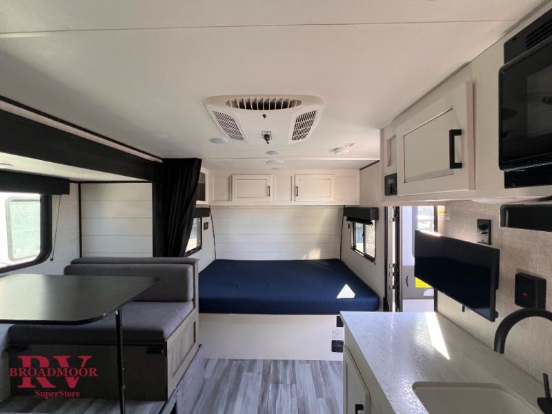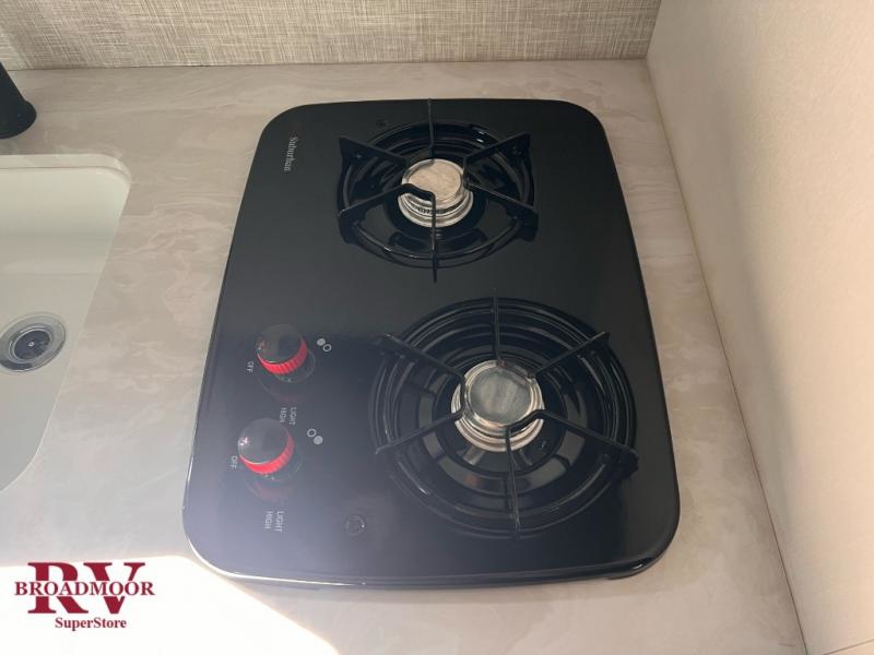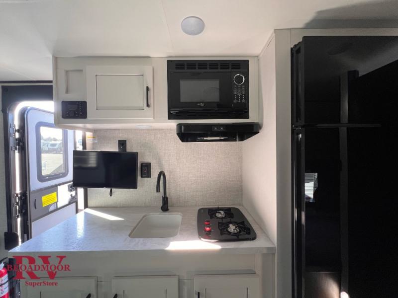 There is room to sleep up to six people in this Jay Flight SLX travel trailer with the 29" x 75" bunk beds, a booth dinette once converted, and on the queen bed. There is also added living space thanks to the single slide, and the private bathroom adds convenience for everyone with its tub/shower and toilet. The kitchen has all of the necessities for you to create delicious meals, like an 8 cu. ft. 12V refrigerator, microwave oven, and two-burner range, and you also have overhead cabinets to use for keeping your items organized.