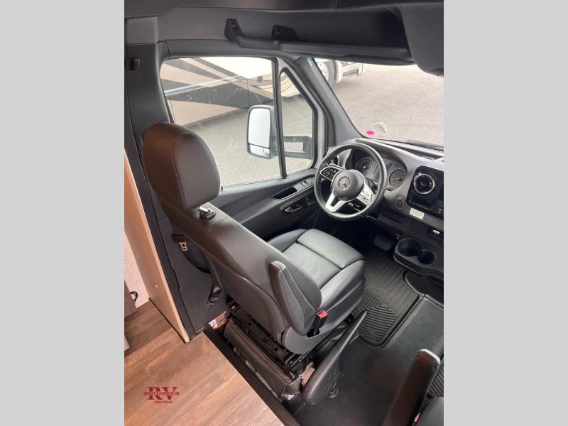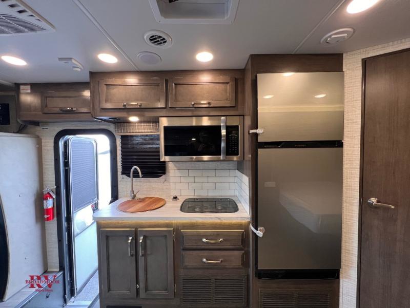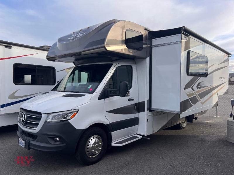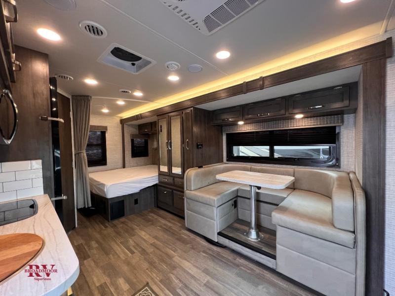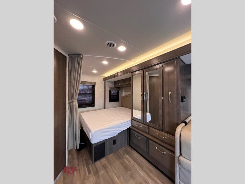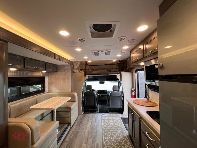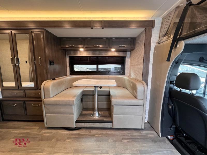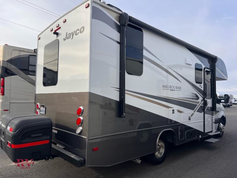 Each Melbourne Class C diesel motorhome by Jayco features durable Stronghold VBL lamination, bead-foam insulation, and a seamless front cap that resists wear and tear from the elements. The updated 2L V4 twin turbo 211HP diesel engine with 332 ft. lb. torque will power your trips near and far, and the Mercedes-Benz chassis is ultra durable. There are seatbelts in all designated seating locations, and the captain's seats swivel around so they can become a part of the living area once parked. You'll appreciate an Onan 3,600-watt LP generator on board, as well as a 13,500 BTU A/C and a 30,000 BTU furnace to keep you comfortable year around. The interior of the Melbourne will have you feeling right at home with high-intensity LED lights, an 83" interior height with a padded vinyl ceiling, hardwood cabinet doors and drawers, and more!