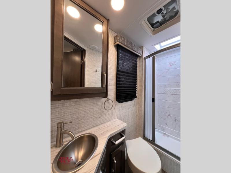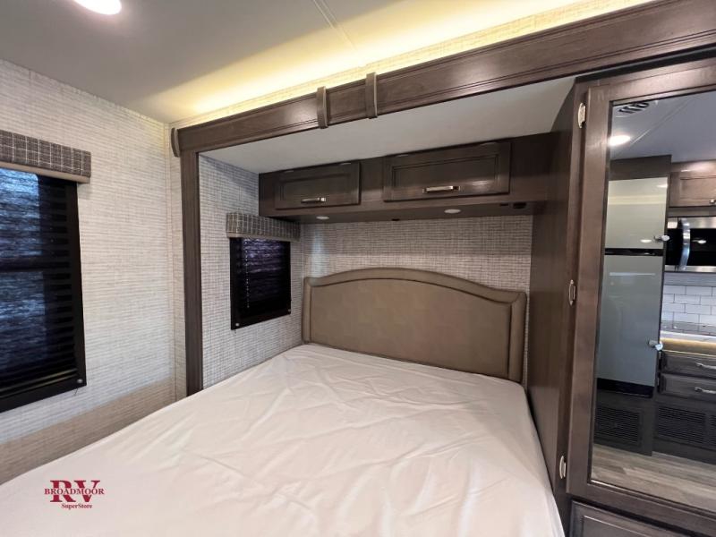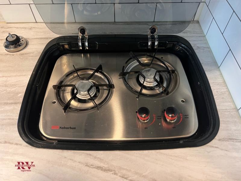 Head across the states in this comfortable coach that can sleep five each night. You will enjoy an RV queen bed just like you have at home, and your guests can sleep on the U-shaped dinette and cab-over bunk. If you're not needing the overhead bunk, just choose the optional front entertainment center with a 32" LED HDTV, and the dinette can also be optioned out for theater seating to make this a couples coach. You can prepare all your meals on the Suburban two burner drop-in cooktop, or use the convection microwave. The flip-up counter will provide more counter space, and all your perishables can be stored in the 10 cu. ft. 12V refrigerator.