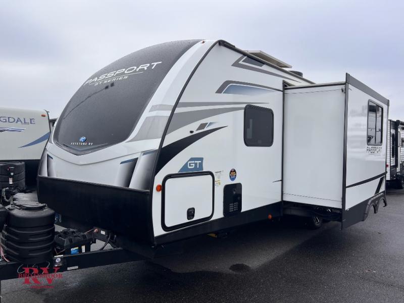 Each one of these Keystone RV Passport GT travel trailers offer grand style and multi-functional features! They have best-in-class storage for big things like paddle boards and small things like sleeping bags. There's no need for cordless drills and bending over to put the jacks down, simply push a button and the power stabilizer jacks do the rest. The one piece polypropylene underbelly protects your units vitals in all weather conditions. Exclusive to Keystone is the Tru-fit slide construction and the Hyper Deck flooring which is more resilient, stronger and lighter than the traditional laminated wood construction, plus it resists water and water damage. In-floor heating ducts help to heat the unit with the 30,000 BTU furnace and the color-coded unified wiring makes it easier to see where they connect to. Come find the one that best fits your needs today!