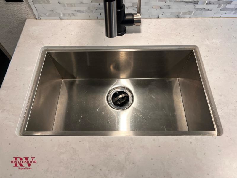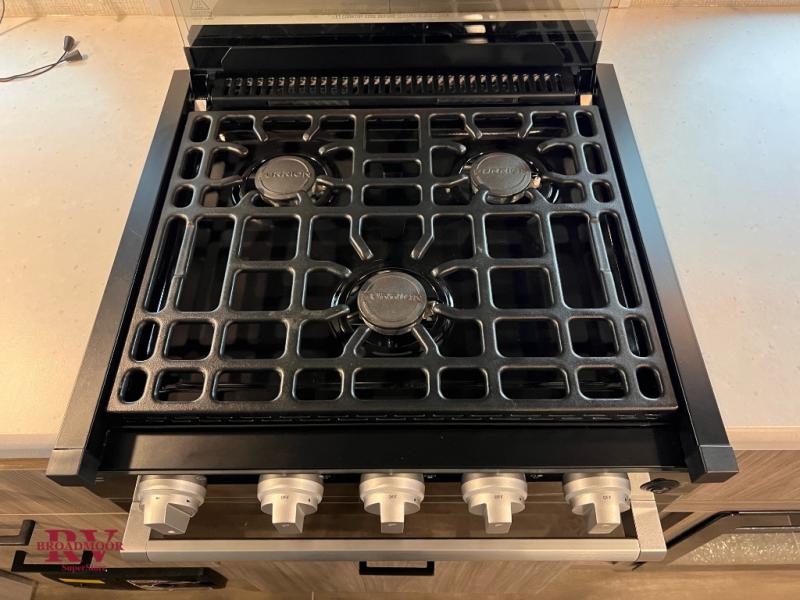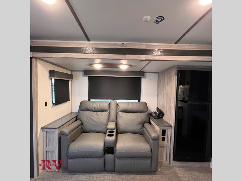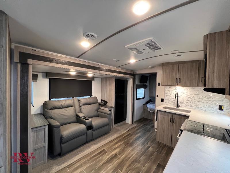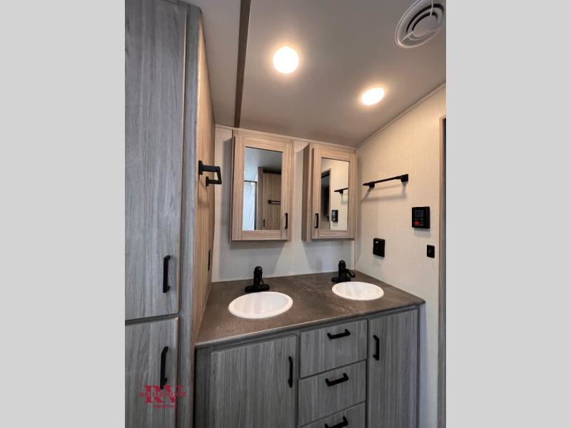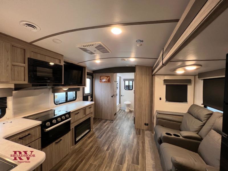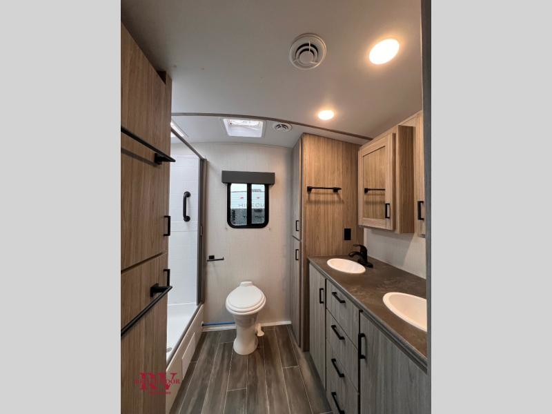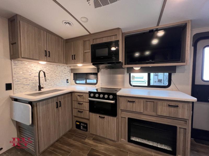 You won't even feel like you're camping in the woods with this travel trailer! It features a front private bedroom with a queen bed to lay your head on at night and wardrobes/nightstands on either side of it for your items. Prepare your best home cooked meals with the three burner cooktop and flip-up countertop then enjoy them at the U-shaped dinette with the refrigerator right next to it so you don't have to go far for a drink refill. The dinette is also across from the entertainment center with a fireplace for a cozy evening indoors, plus you can switch out the dinette for an optional theater dinette. The full rear bathroom has a dual sink vanity for two to get ready at once and an area prepped to add an optional washer and dryer for clean clothes the whole trip!