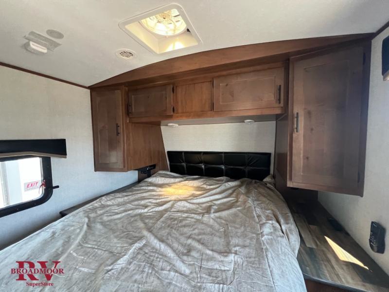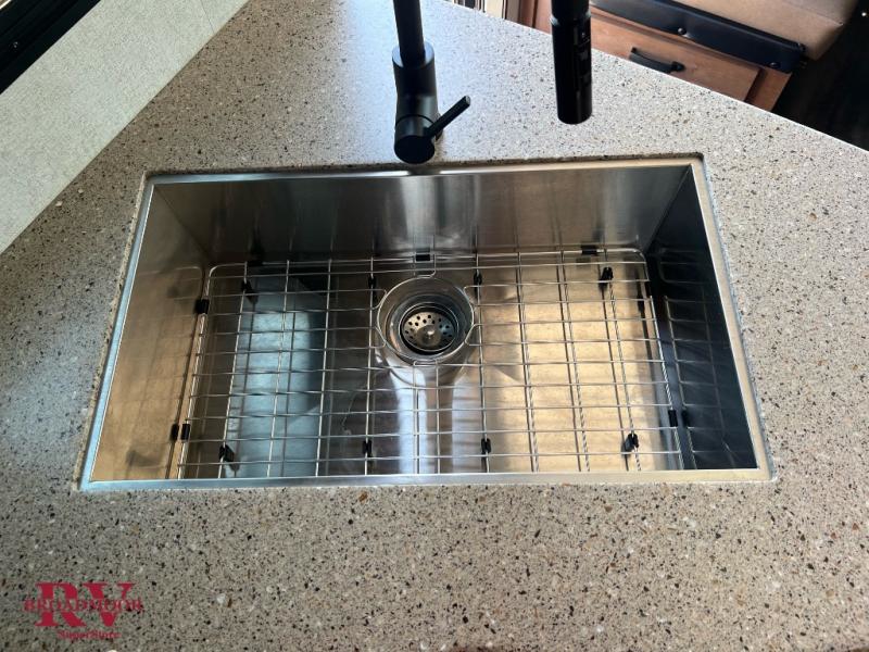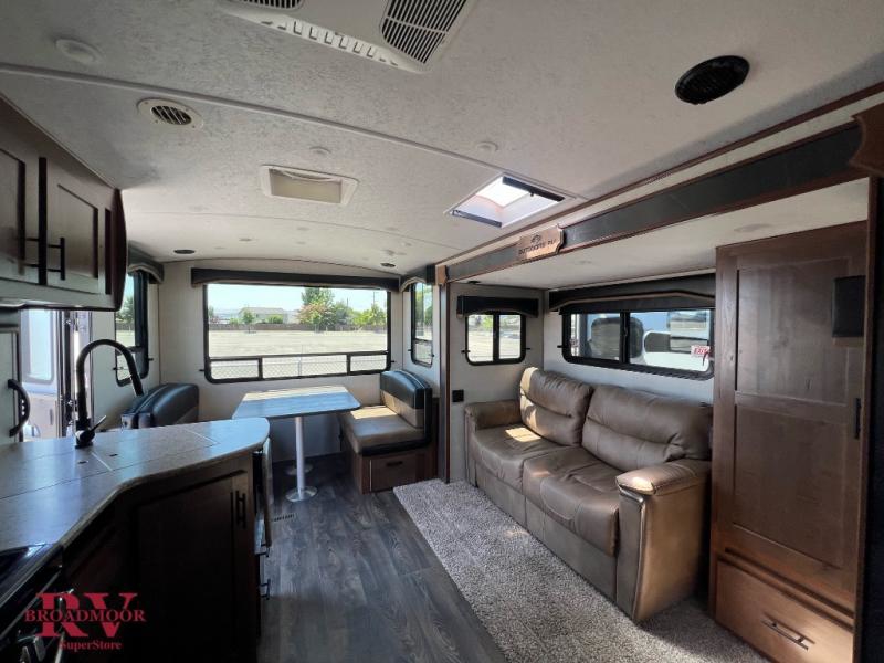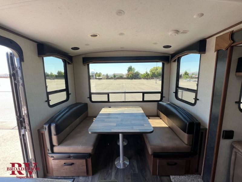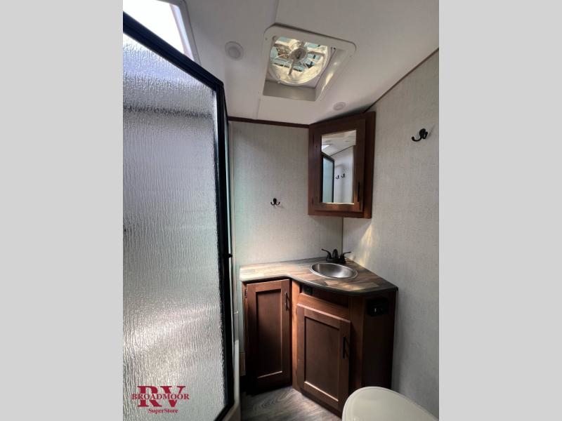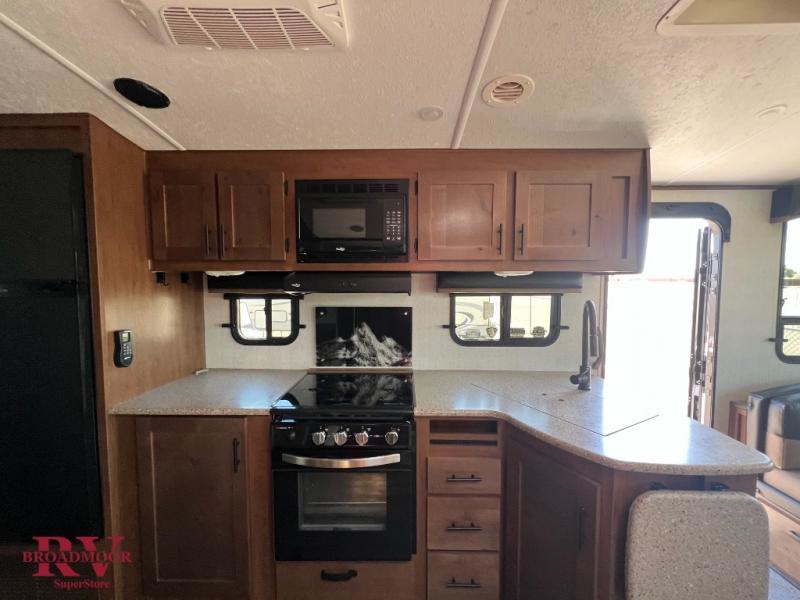 Camping trips are made complete when you have this travel trailer in tow. The rear mountain dinette provides a place to enjoy meals together, and the sleeper sofa slide out is close to the entertainment center for easy viewing of your movies. And if you're not needing the extra sleeping space, you can choose the optional residential sofa with built-in recliners! The chef of your group can prepare home-cooked meals in the kitchen, especially with a flip-up counter for more space. There is also a pantry, sunken range, 10 cu. ft. 12V refrigerator, plus a high-rise pull out faucet for easy clean up. The full bath is towards the front of the unit where you'll find the private bedroom, complete with a queen bed and plenty of storage space for clothes, shoes, and more!