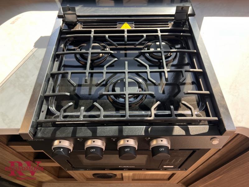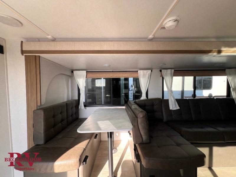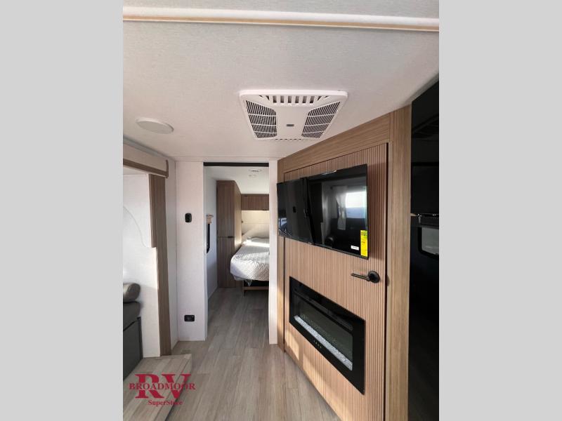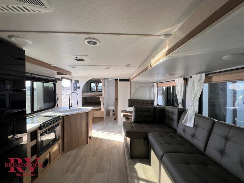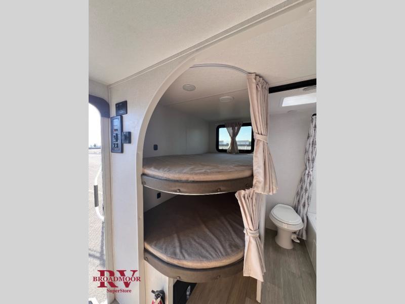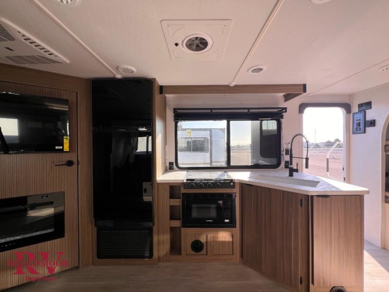 You're sure to make camping memories in this spacious travel trailer! You can easily sleep eight people each night thanks to the double-size bunks, the custom king bed with Versa Tilt in the front bedroom plus the Versa-Lounge within the large slide out! The cooktop and microwave oven will let you make meals each day, and you'll appreciate the hidden pantry with shelves behind the fireplace. There is also a booth dinette where you can dine together or play a game of cards after dinner is cleaned up, or you may just find yourselves outdoors under the 18' awning with 4K blade lighting. And don't overlook the full bath, complete with a tub/shower that will make bath time easier if you have little ones.
