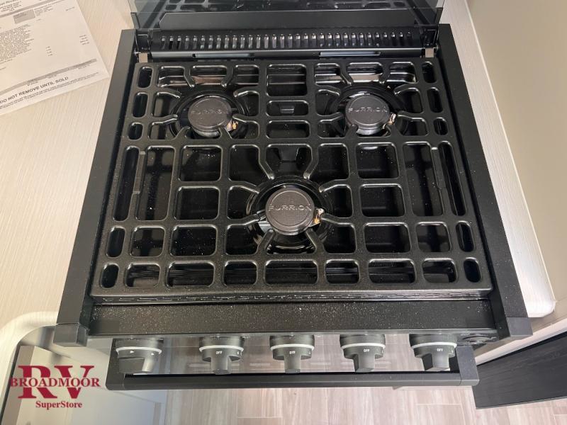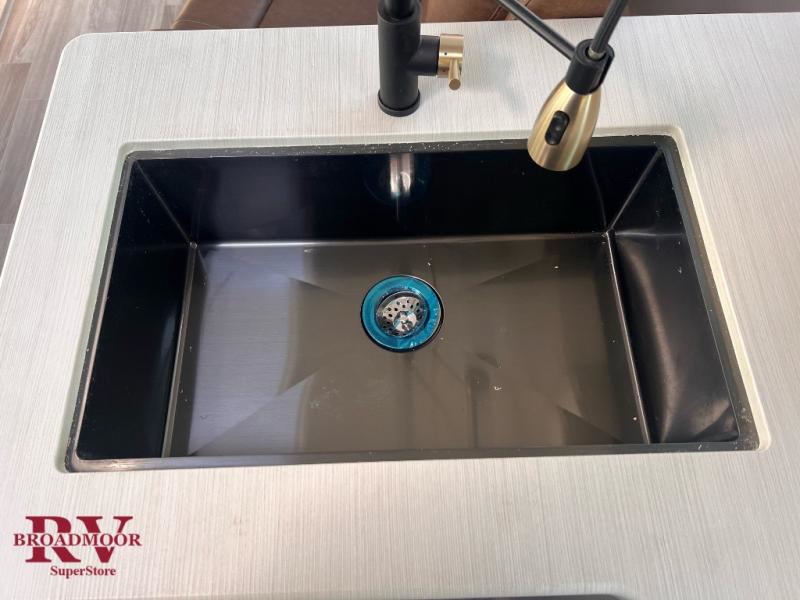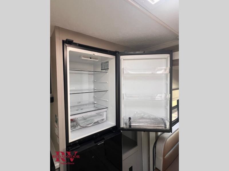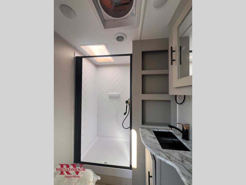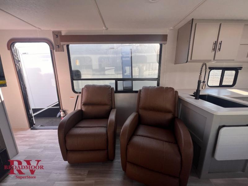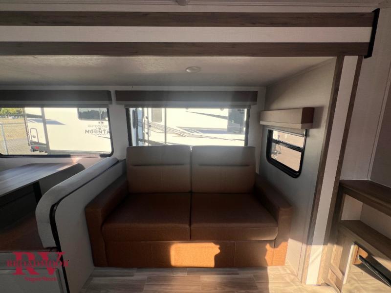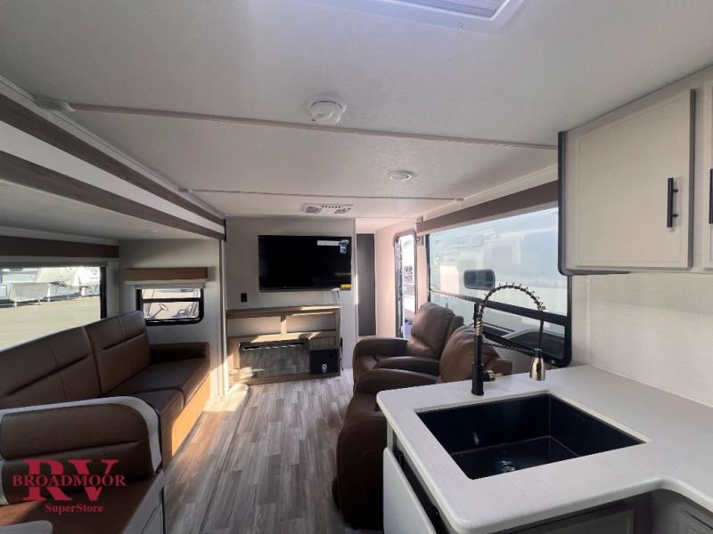 Escape to the great outdoors in this Vibe travel trailer. Once you arrive at your campsite, set up the 20' electric awning with LED lights, then grab the fishing poles from the large pass-through storage. You may want to make a quick lunch on the three burner cooktop before heading out. When you get home, relax on the sleeper sofa or the recliner chairs by the entertainment center with fireplace. The spacious full bath includes a 36" x 30" walk-in shower to clean up every day, and there is a linen closet to store clean towels and necessities.