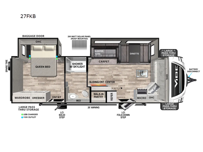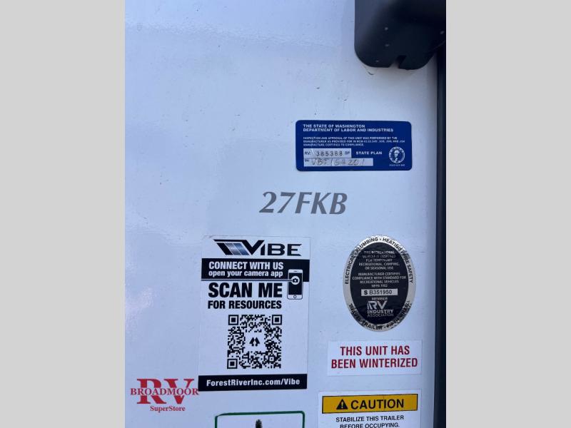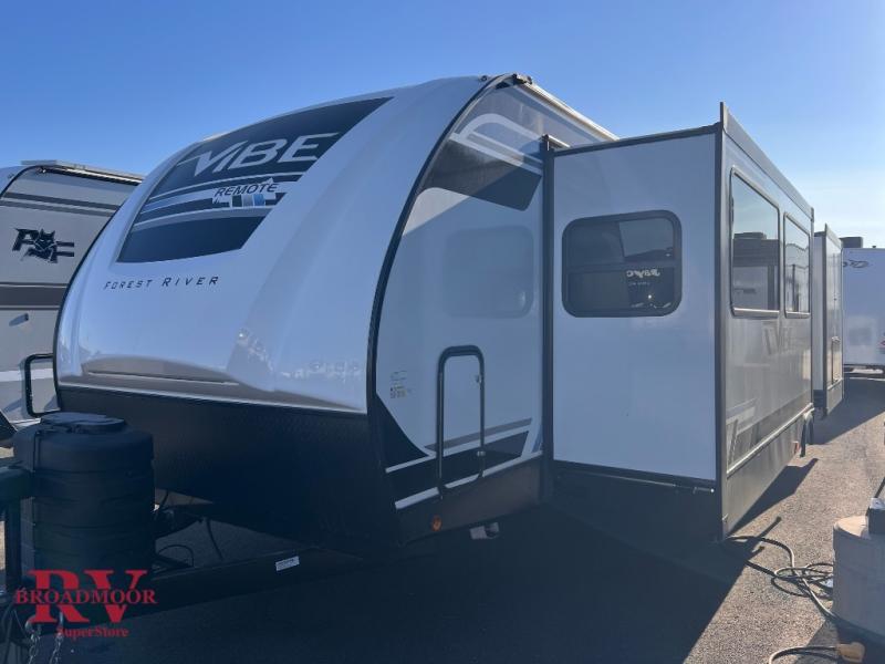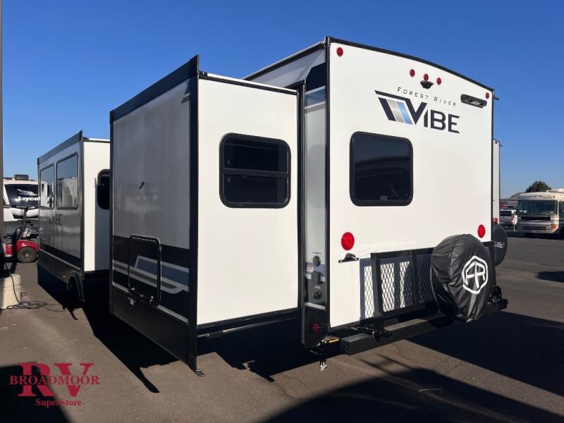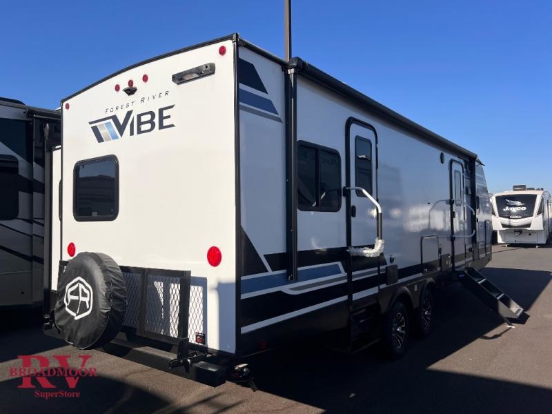 Each Vibe travel trailer by Forest River includes Hyper Lyte construction and a durable laminated "Aluma Frame" for years of use. The heated and enclosed underbelly allows you to extend your camping season, and the walk-on truss roof with XTRM PVC roofing will be easy to keep clean. Inside, you'll enjoy the custom built cabinetry, solid surface thermofoil wrapped kitchen countertops, and ultra bright LED lighting throughout. These models also include cable and satellite prep and a digital TV antenna with a booster so you can stay connected to the outside world if you choose. Make the easy choice and choose a Vibe travel trailer today!
