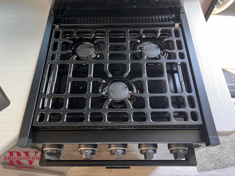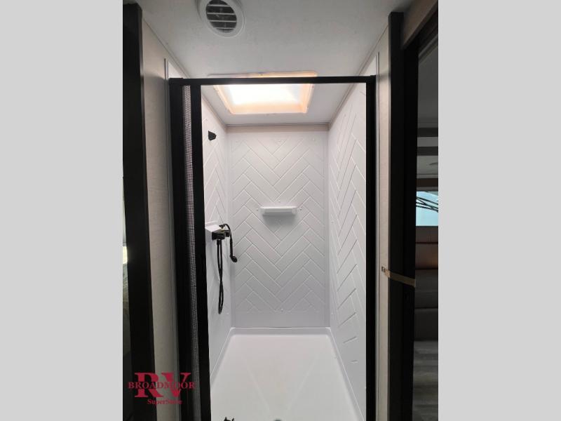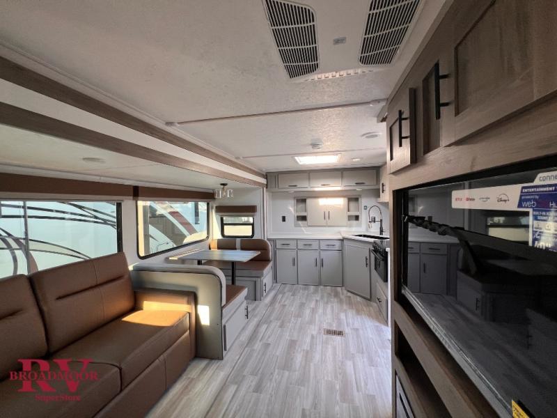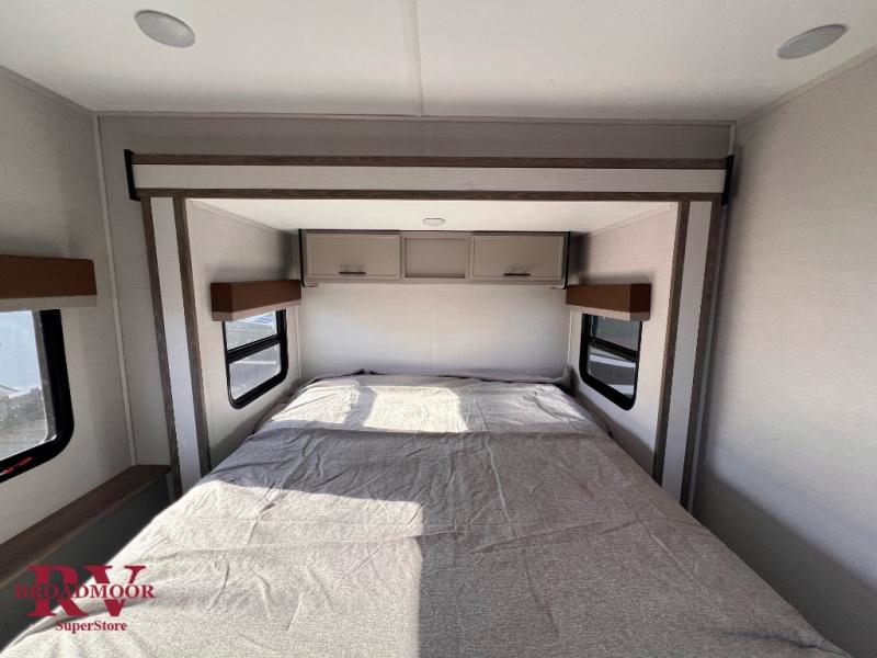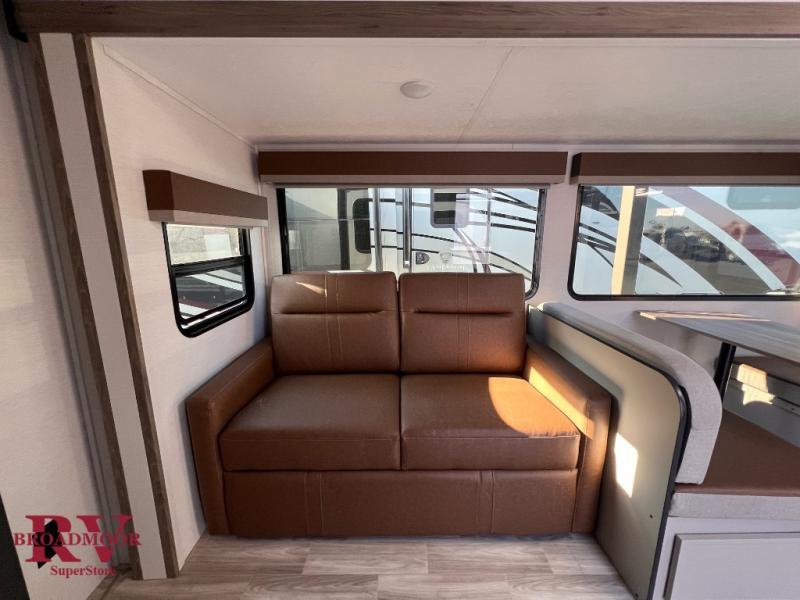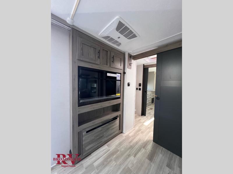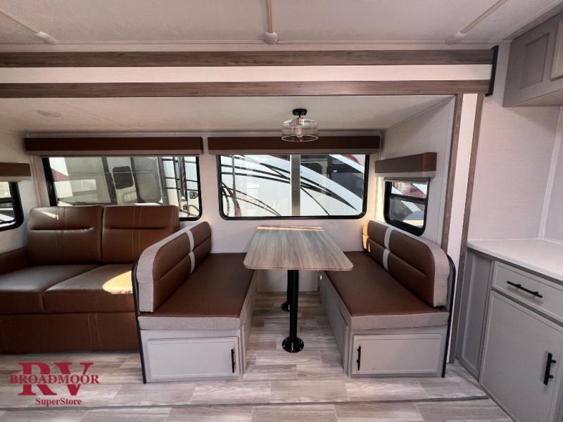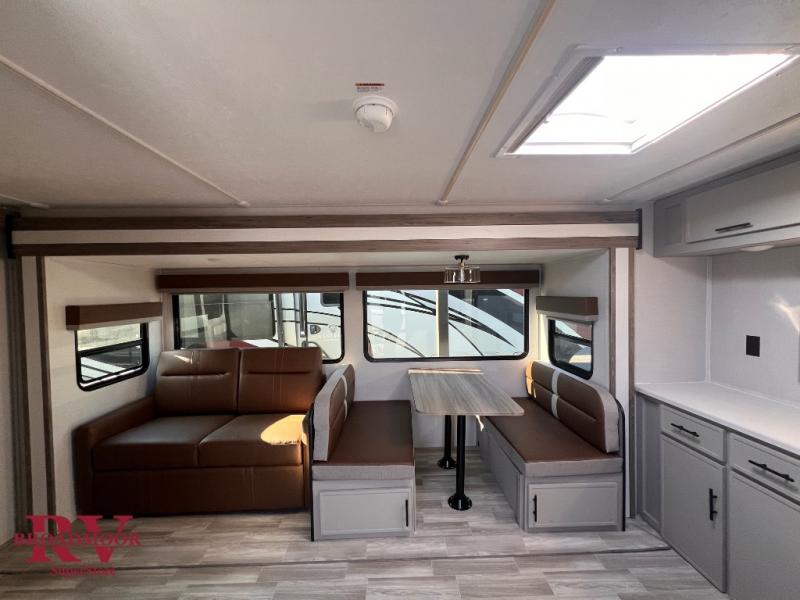 This double axle travel trailer is perfect for your family of five for trips to the lake campground. You'll appreciate ample counter space in the front kitchen and dual slides for more space to relax. Once you've set up the 19' electric awning and grabbed your bags from the large pass-through storage, head inside to play a game at the booth dinette. There is also a sleeper sofa in perfect view of the fireplace and entertainment center. This model also includes a walk-in pantry behind the sliding entertainment center plus a spacious walk-thru bath to easily clean up each day.
