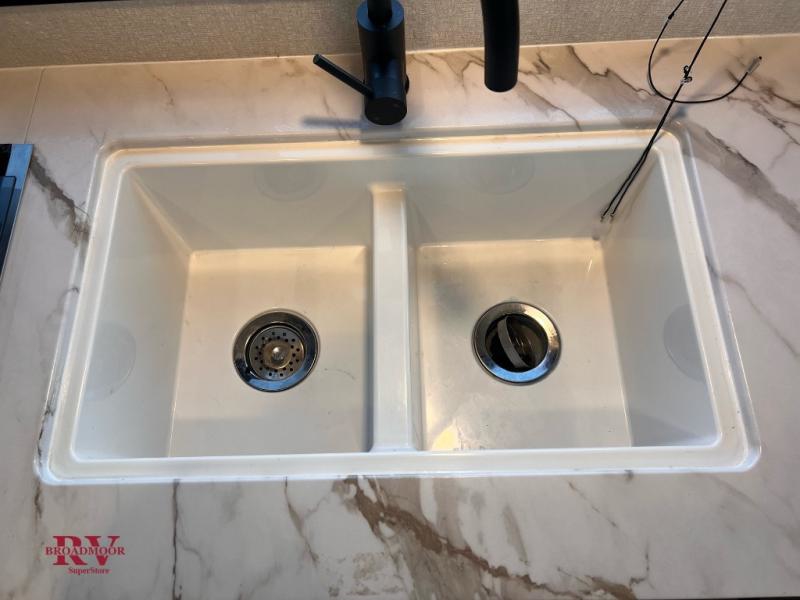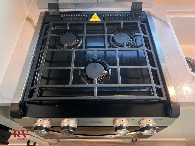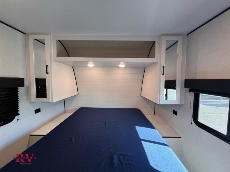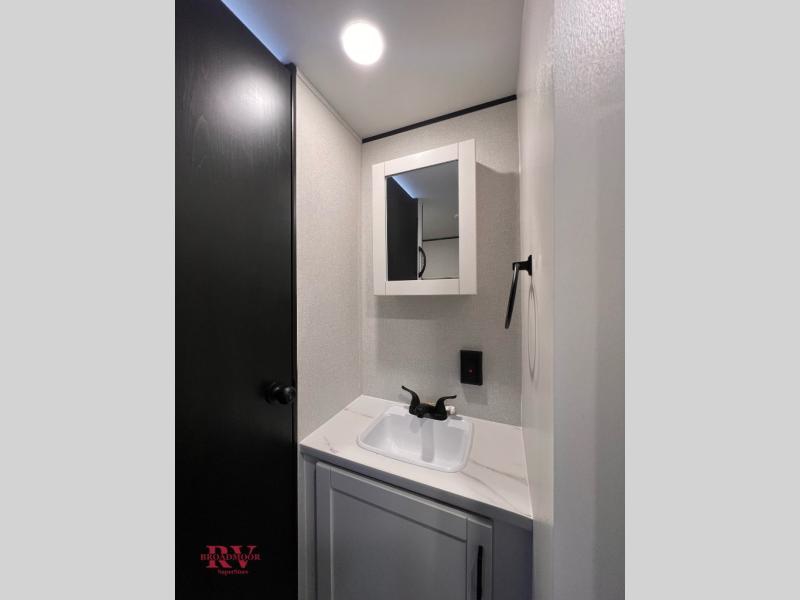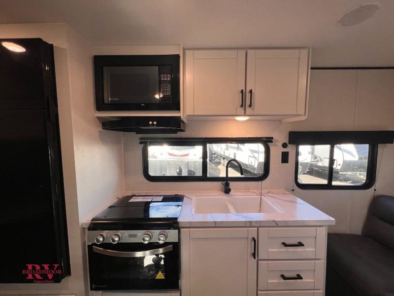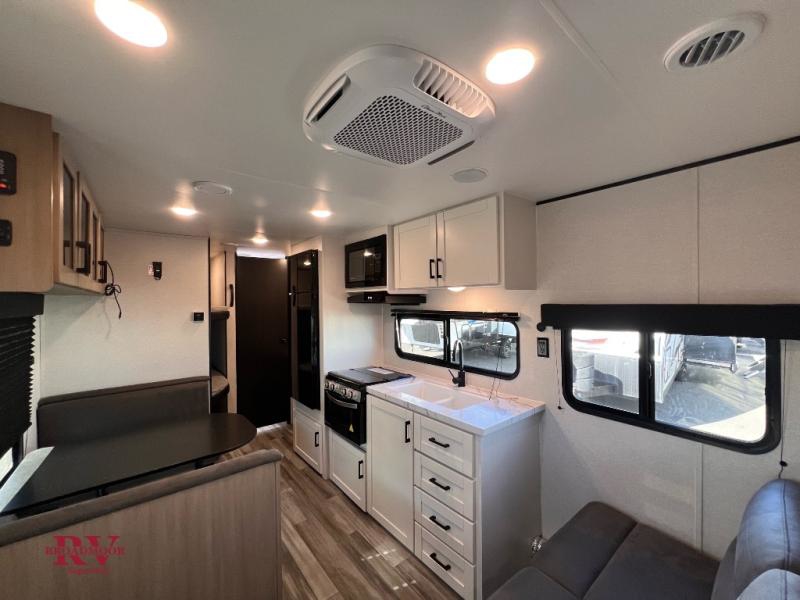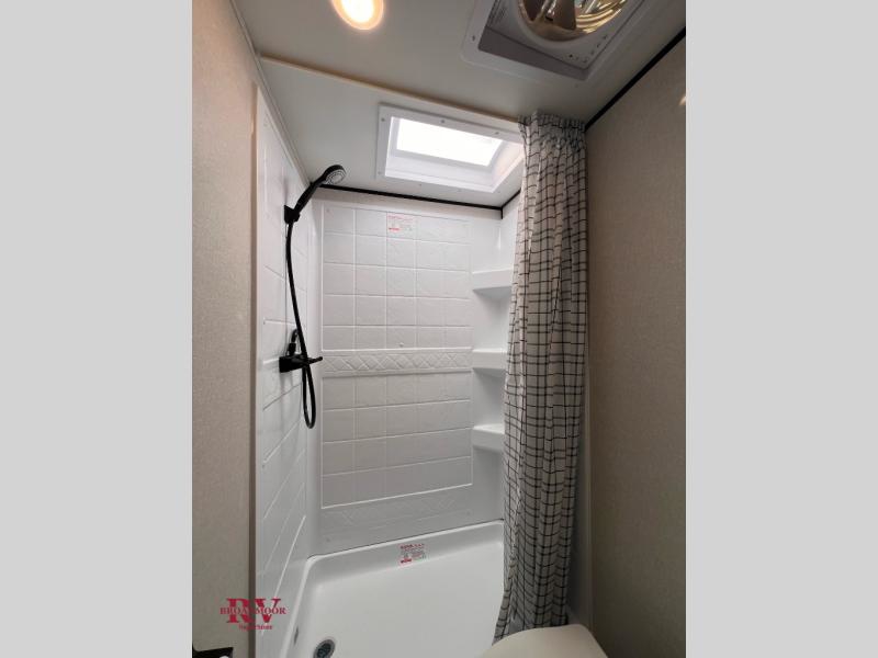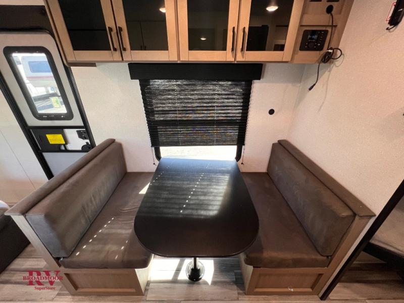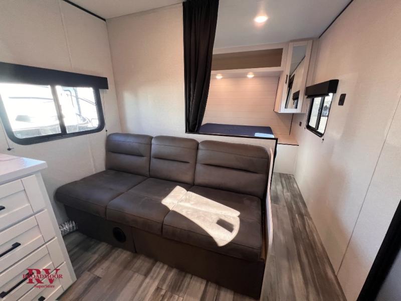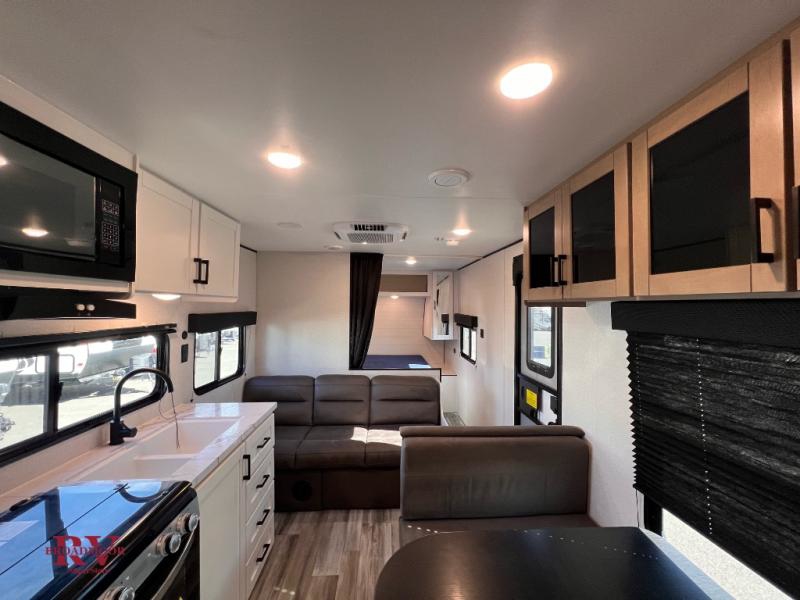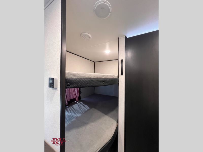 You can comfortably sleep up to eight people in this trailer thanks to the double-size bunks, the RV queen bed in the front bedroom, plus the booth dinette and jack-knife sofa in the main living area! The chef of your crew will have a three burner cooktop and microwave oven to prepare meals, and everyone can store their favorite drinks in the 8 cu. ft. 12V refrigerator. The bathroom includes a tub/shower and a toilet, with the sink just outside of this room so others can brush their teeth if one is taking a shower before bed. The outside storage will let you bring along fishing poles and the 16' power awning with LED lights will create a nice place to gather in the evenings!
