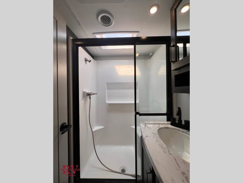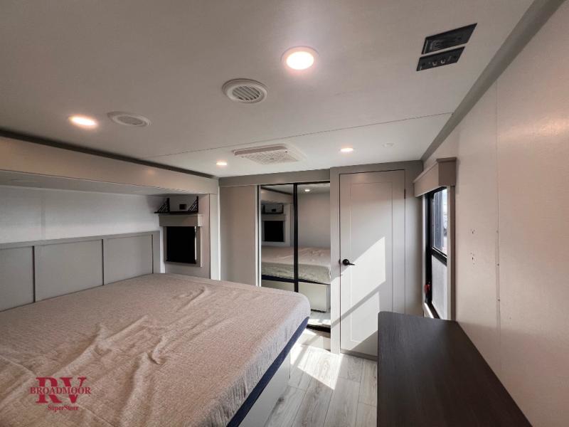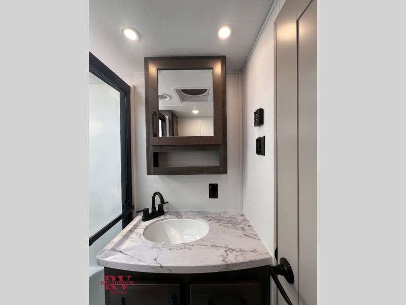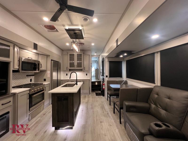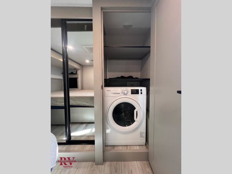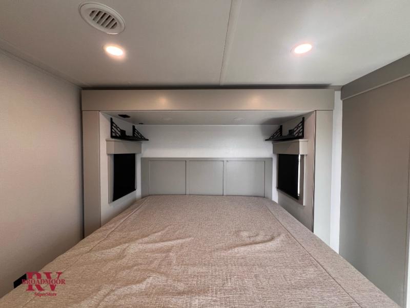 Two full bathrooms and two private bedrooms make this fifth wheel perfect for camping with friends and family. The front bedroom includes a king bed with a queen bed option, a large front wardrobe, plus stackable washer and dryer prep. The rear master bedroom has two closets plus a dresser and underbed storage, plus its own full bath with an exterior entry door for convenience. There is even a loft above the rear bedroom for even more sleeping space! Everyone can meet in the main living area/kitchen to relax on the power theater seat as the chef cooks dinner, and you can watch a show on the Smart HDTV to pass the time. The kitchen island will provide more counter space, along with the hutch that includes overhead cabinets as well. Don't let this luxury fifth wheel slip away!