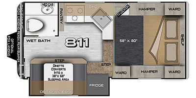 Whether you camp, hunt or even fish once you have arrived at your destination, this truck camper provides plenty of comforts and conveniences so you can choose your fun. The rear entry places you inside to find a wet bath along one side and a booth dinette slide with fridge on the other. You can dine and even sleep here once converted into a 38" x 68" sleeping area. And there is an optional bunk above. The cook will love the large stainless steel sink, the pantry and the three burner cooktop when making meals inside. The 58" x 80" NW TruRest queen mattress with bedspread will allow you to get a good night's rest. And you will find plenty of storage in the three wardrobes and your dirty clothes can go into one of the two hampers.