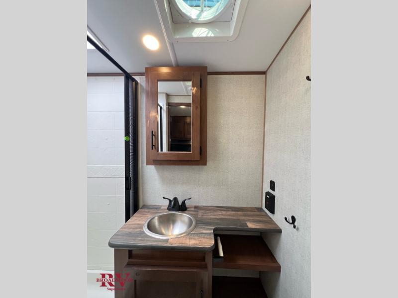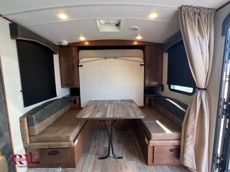 Versatility and comfort is found in this spacious travel trailer. There is a queen Murphy bed up front that can fold away into the wall so you can dine at the fold down booth dinette. The residential sofa with built-in recliners will be the perfect place to relax as you watch a movie on the swing out 32" TV, and the single slide out here will provide more interior space. This model includes a rear corner kitchen with plenty of counter space to prep meals and the full bath is in the other rear corner for privacy. You'll also enjoy the shower skylight for more head room, plus a living area skylight for more natural light.