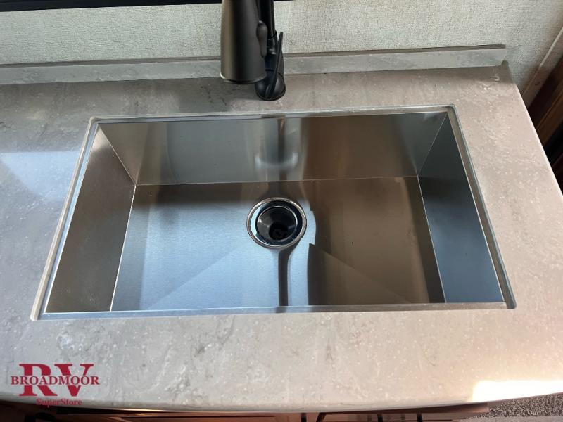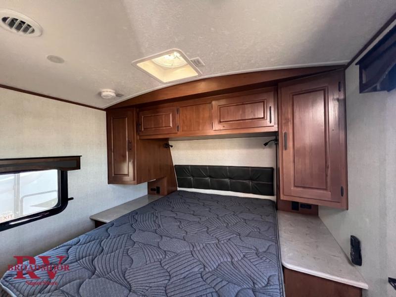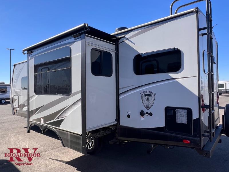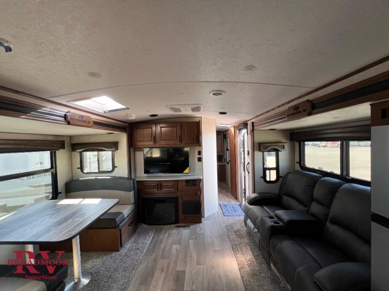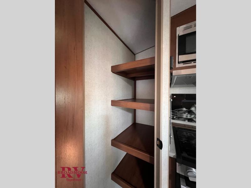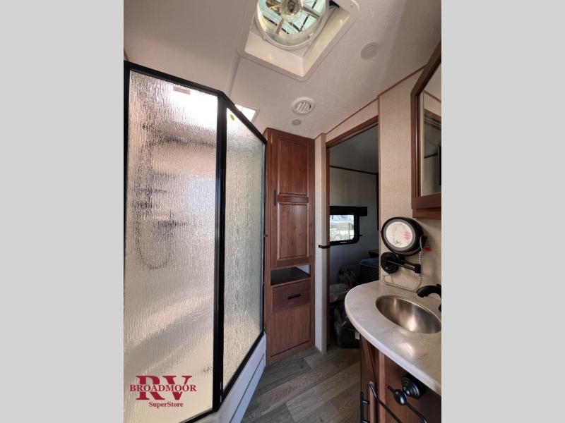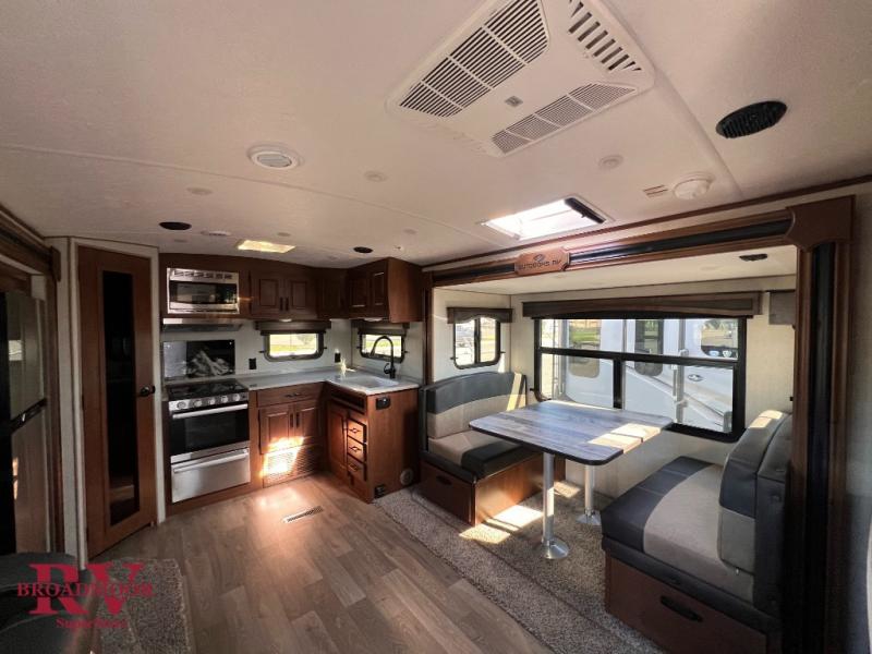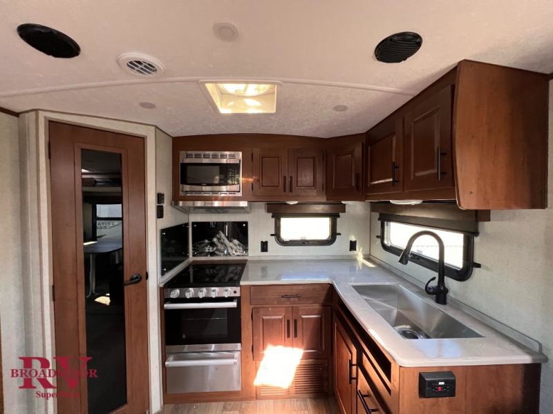 Enjoy added space in this travel trailer with dual opposing slides in the main living area. Your crew can visit on the residential sofa with built-in recliners or play a game at the mountain dinette while the chef whips up dinner in the rear kitchen. A spacious dual entry bath will allow you to clean up after your adventures, and a front master bedroom will have you feeling right at home. This model also includes a swing-out 40" TV in the main living area so rainy days can be spent watching movies!