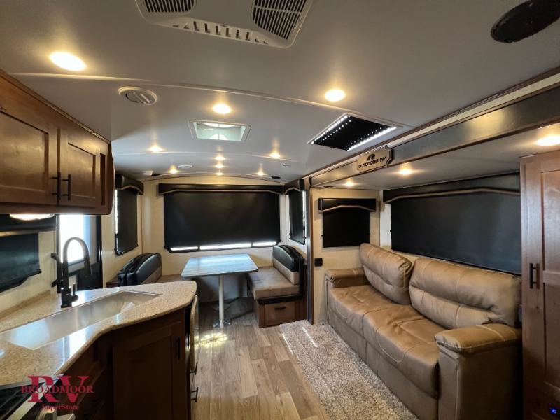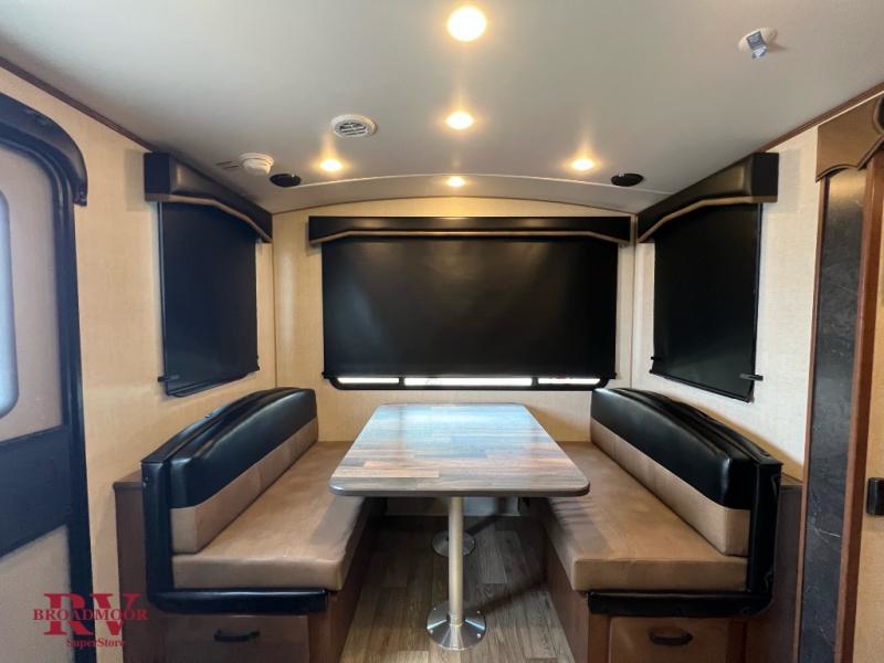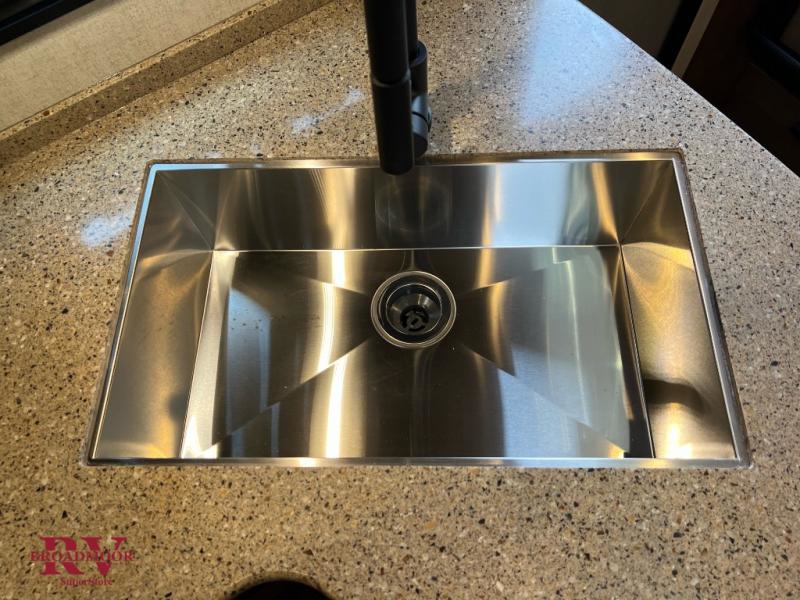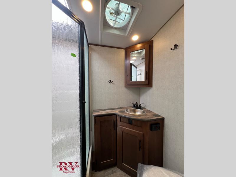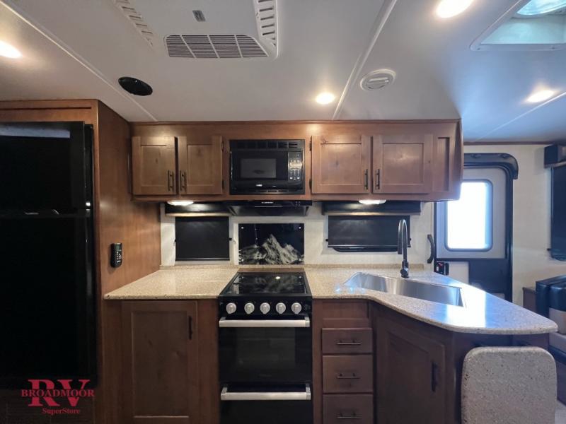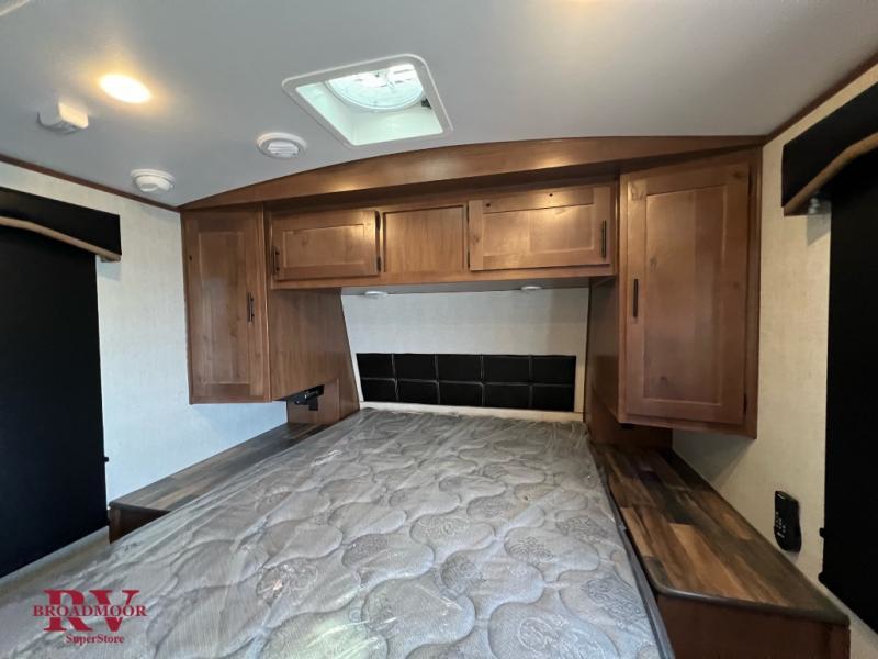 Camping trips are made complete when you have this travel trailer in tow. The rear mountain dinette provides a place to enjoy meals together, and the sleeper sofa slide out is close to the entertainment center for easy viewing of your movies. And if you're not needing the extra sleeping space, you can choose the optional residential sofa with built-in recliners! The chef of your group can prepare home-cooked meals in the kitchen, especially with a flip-up counter for more space. There is also a pantry, sunken range, 10 cu. ft. 12V refrigerator, plus a high-rise pull out faucet for easy clean up. The full bath is towards the front of the unit where you'll find the private bedroom, complete with a queen bed and plenty of storage space for clothes, shoes, and more!