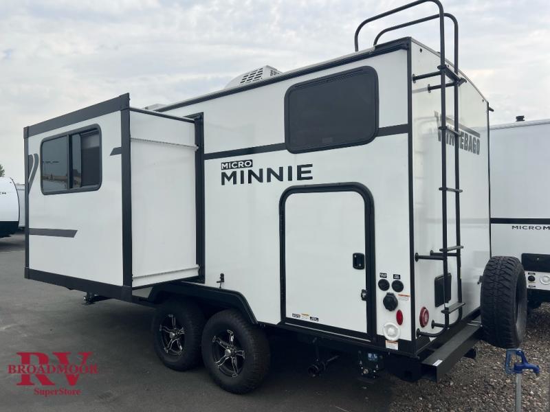Start out on your boundless journey in one of these Winnebago Micro Minnie travel trailers! Towing is made simple with the 7' width to keep your Micro Minnie in your rear-view mirror. They don't lack in features either although they are compact in size. The spacious galley including a sink, refrigerator, a cooktop, and even a convection microwave oven allows you to cook without compromise. You will not only enjoy the entertainment found indoors with a Smart TV, a JBL premium sound system and Aura Cube high performance mechless media center, but outdoors you will also enjoy the JBL premium speakers and a power awning with LED lighting. Each model also comes with flexible exterior storage to make packing quick and easy, a 200-watt solar panel for off-grid camping, and Dexter TORFLEX torsion stub axles for smooth towing!