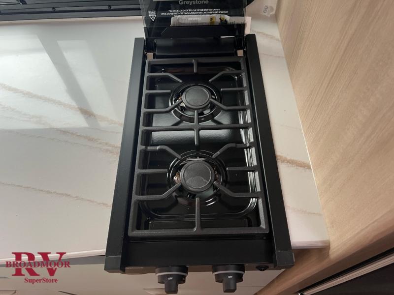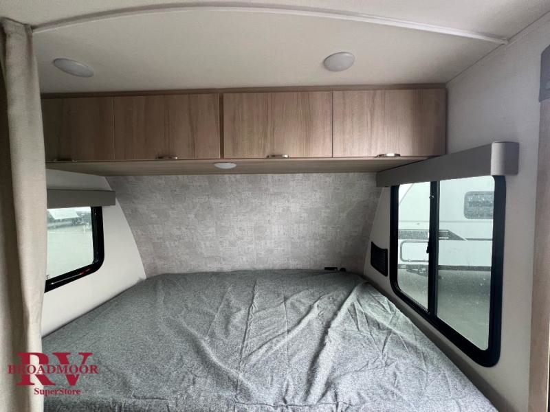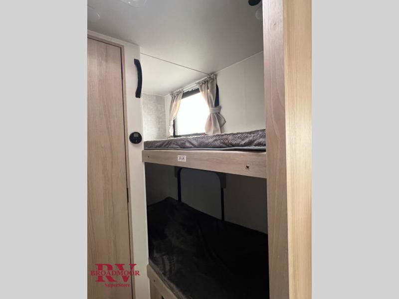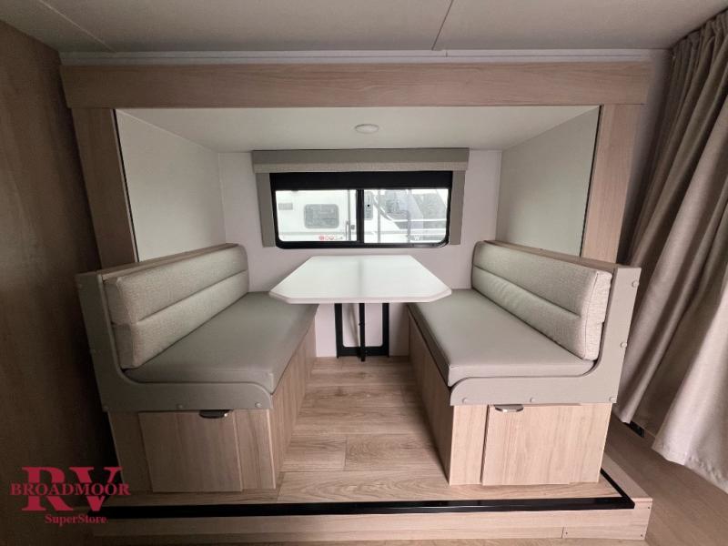 Get ready for a fun family weekend in the great outdoors with this trailer only steps away to enjoy inside comforts! The cook will love having everything to make warm meals, and can easily store leftovers in the 10.3 cu. ft. 12V refrigerator, plus the flip-up counter gives them more space to prep or dry the dishes. The front 54" x 74" full bed has a divider curtain for privacy at night and the rear corner 28" x 72" bunk beds are conveniently next to the private toilet and shower room. The booth dinette slide gives you a place to dine as well as sleep one more person, plus you will love the extra floor space that it provides. You might like to choose the EZ Glide Sofa Sleeper and table option in its place, the option is yours!