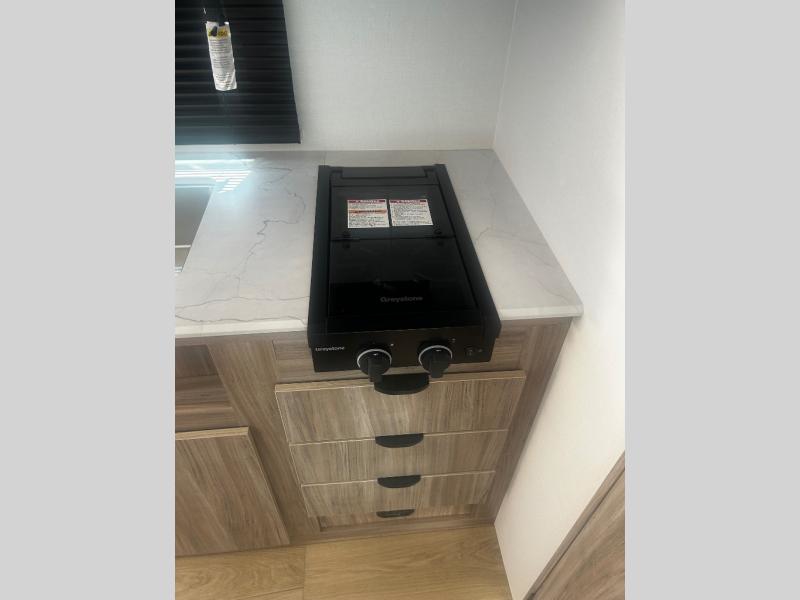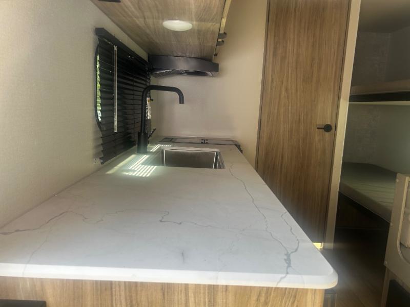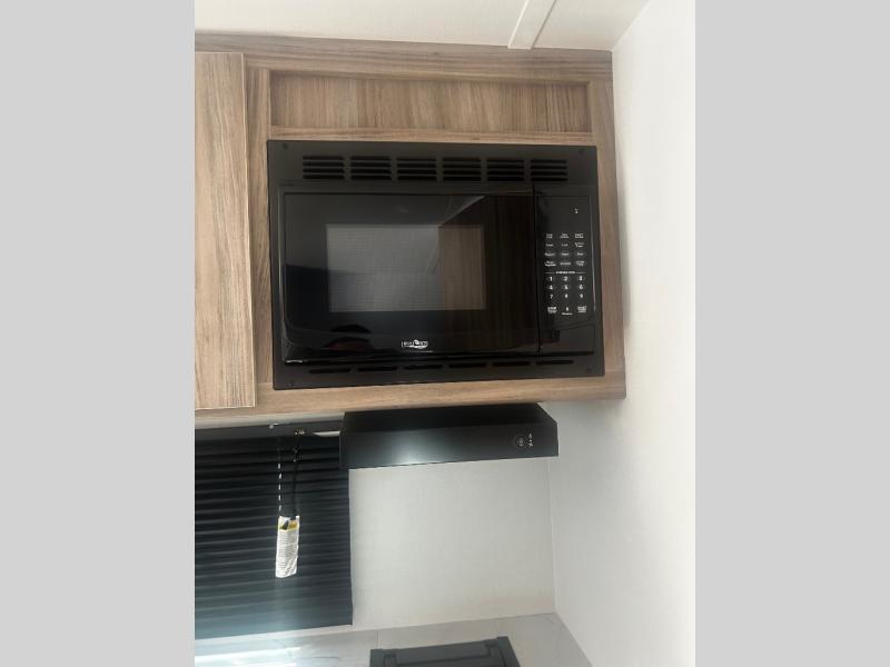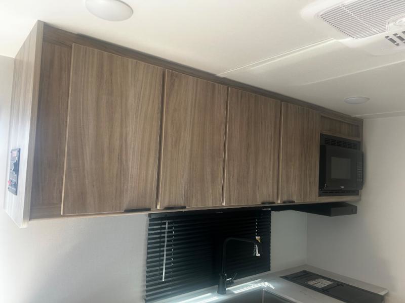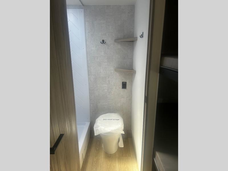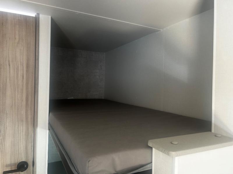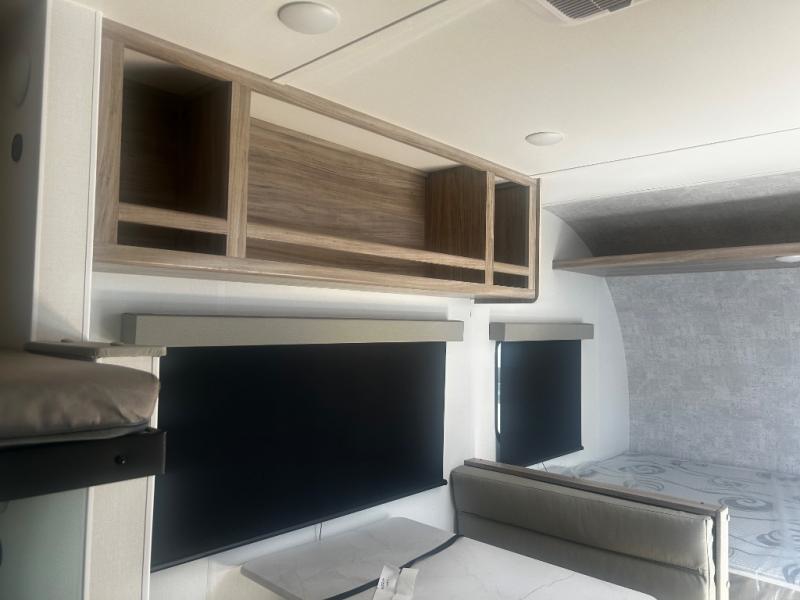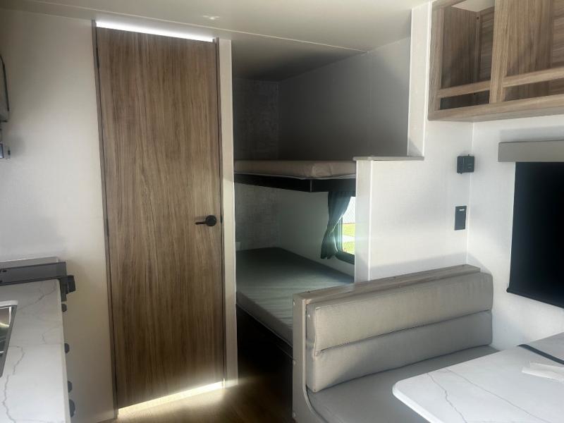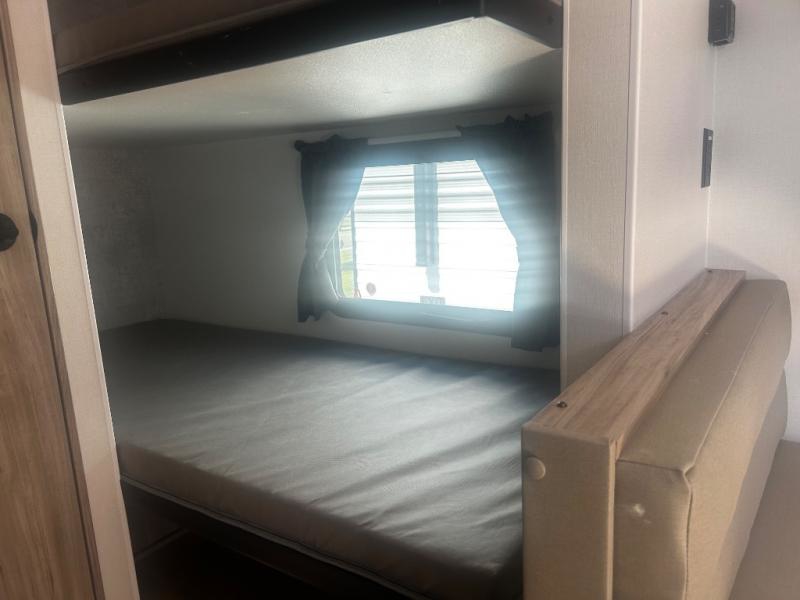 You'll love camping in this travel trailer with bunk beds for your guests or little ones! Once you've unloaded the exterior baggage doors, you can put out the 12' power awning, then head inside to make lunch on the two burner cooktop. There is also a microwave oven and a 3.3 cu. ft. 12V refrigerator for perishables. A booth dinette will provide a place to enjoy your meal at, and an additional guest can even sleep here if needed. After a day of exploring outdoors, you can freshen up in the private bath with corner floating shelves and a 30" x 36" shower with a skylight!
