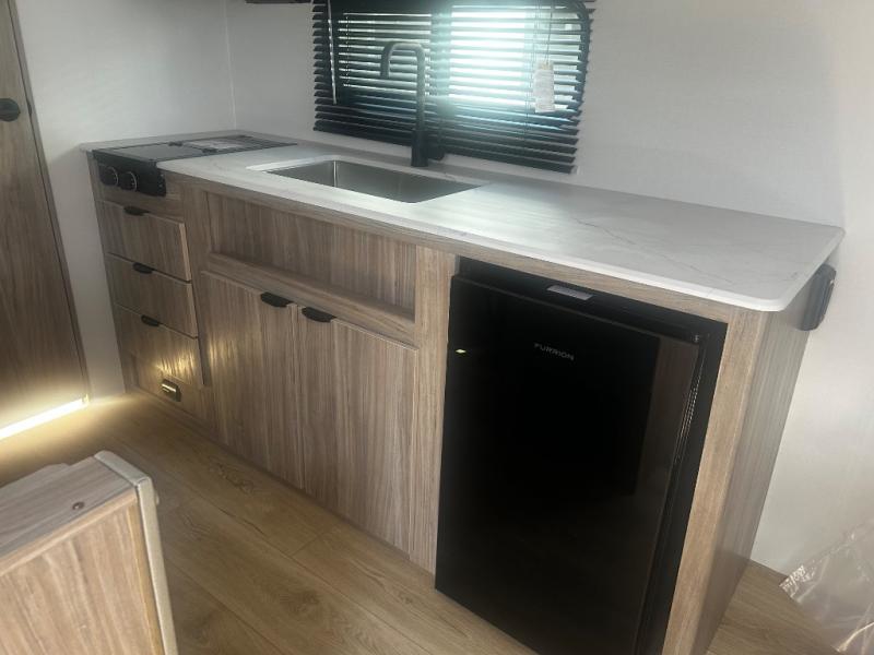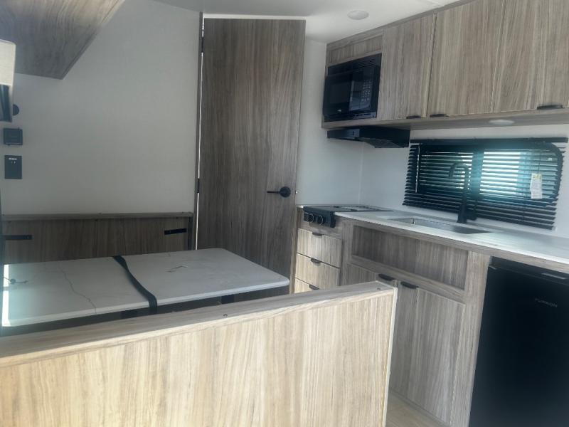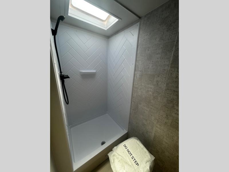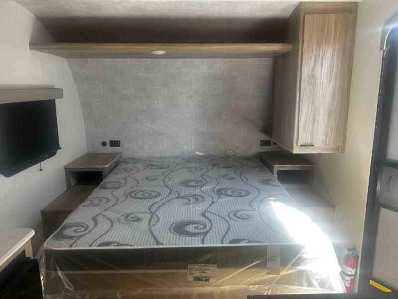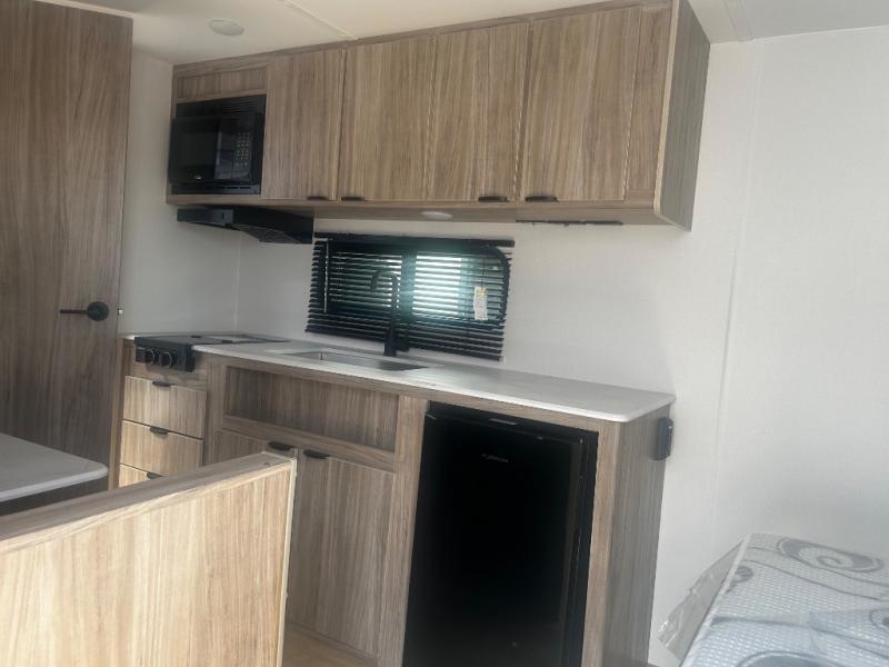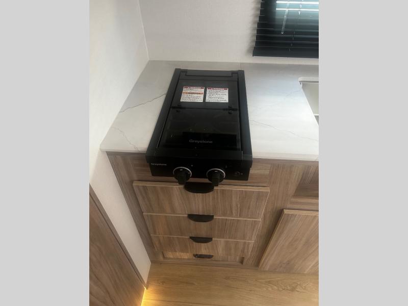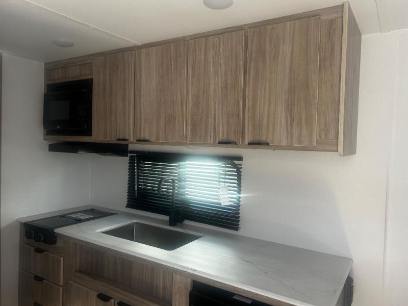 This is the perfect couple's trailer or for those who enjoy solo camping. Once you've unloaded the exterior baggage doors, you can put out the 12' power awning, then head inside to make lunch on the two burner cooktop. There is also a microwave oven and a 3.3 cu. ft. 12V refrigerator for perishables. A booth dinette will provide a place to enjoy your meal at, and an additional guest can sleep here if need be. After a day of exploring outdoors, you can freshen up in the full rear bath that includes a 30" x 36" shower with a skylight and a linen closet for clean towels!