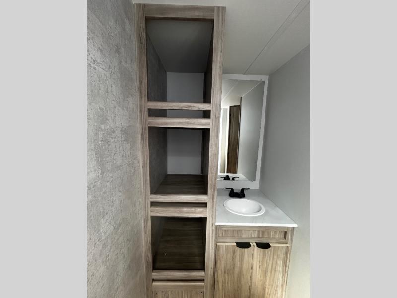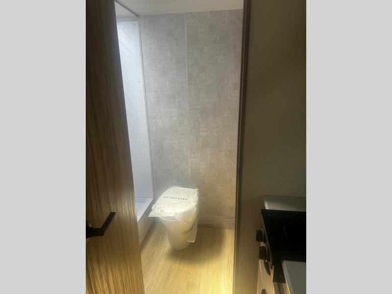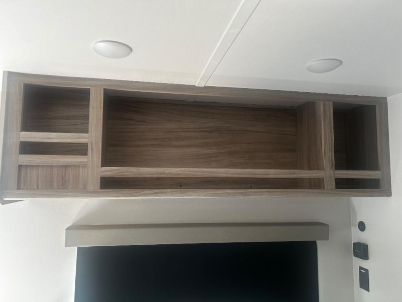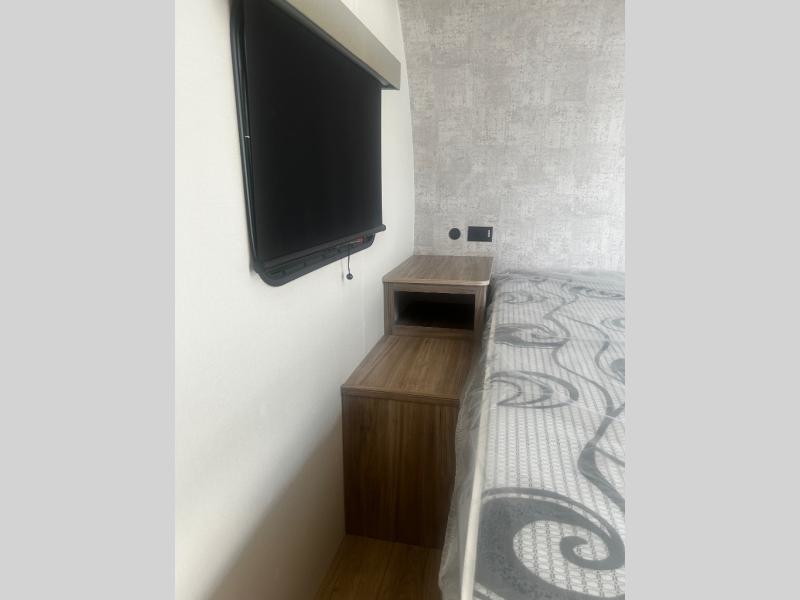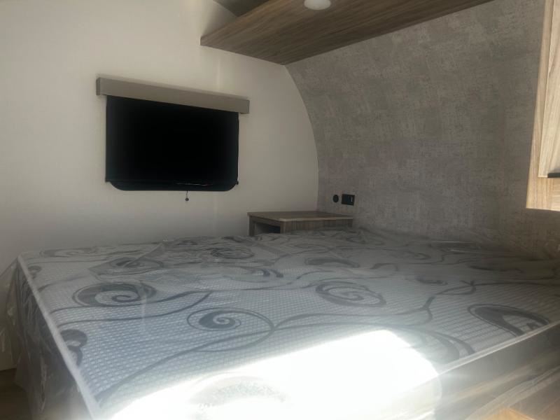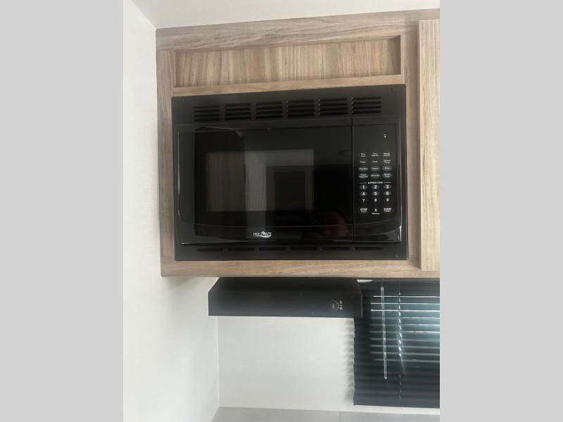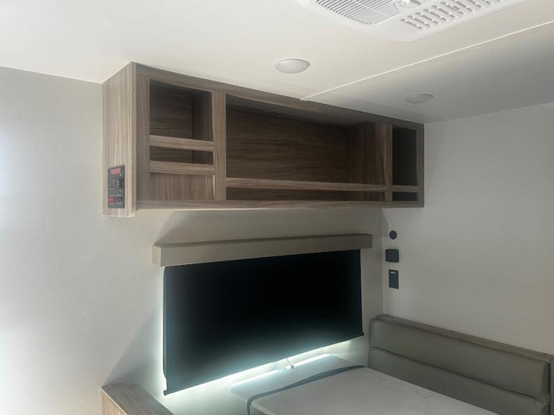 This is the perfect couple's trailer or for those who enjoy solo camping. Once you've unloaded the exterior baggage doors, you can put out the 12' power awning, then head inside to make lunch on the two burner cooktop. There is also a microwave oven and a 3.3 cu. ft. 12V refrigerator for perishables. A booth dinette will provide a place to enjoy your meal at, and an additional guest can sleep here if need be. After a day of exploring outdoors, you can freshen up in the full rear bath that includes a 30" x 36" shower with a skylight and a linen closet for clean towels!