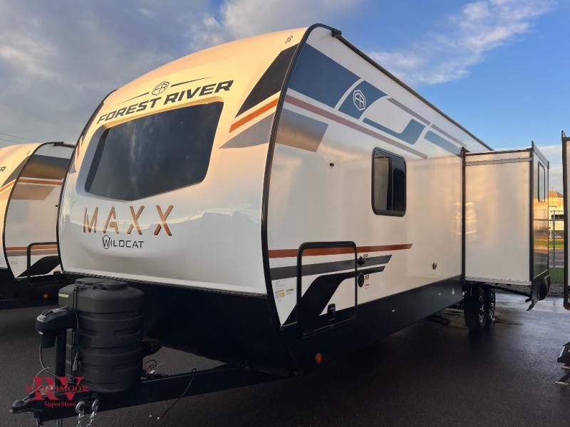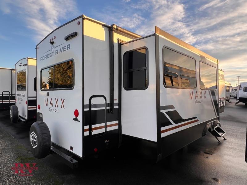 With any Wildcat ONE travel trailer by Forest River in tow, you will find fun and adventure wherever you go! Each model is constructed 2" thick Vacuum-Bonded sidewalls, a Maxx-strength aluminum-framed laminated floor, and double R-7 fiberglass insulation for added protection. These features are included with the Maxx Insulation Package, which also includes slam-latch baggage doors, a fully enclosed underbelly, and more. The Dynamic Technology Package features a 200W expandable roof mounted solar panel with a 30 amp charge controller for off-grid capabilities, backup camera prep, an exterior TV connection, and a frame-mounted receiver hitch to name a few conveniences. A front windshield is found within the Peak Package, along with a power tongue jack, solid surface kitchen countertops, friction hinge entry doors, and an exterior ladder prep.