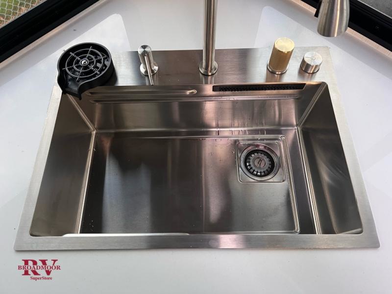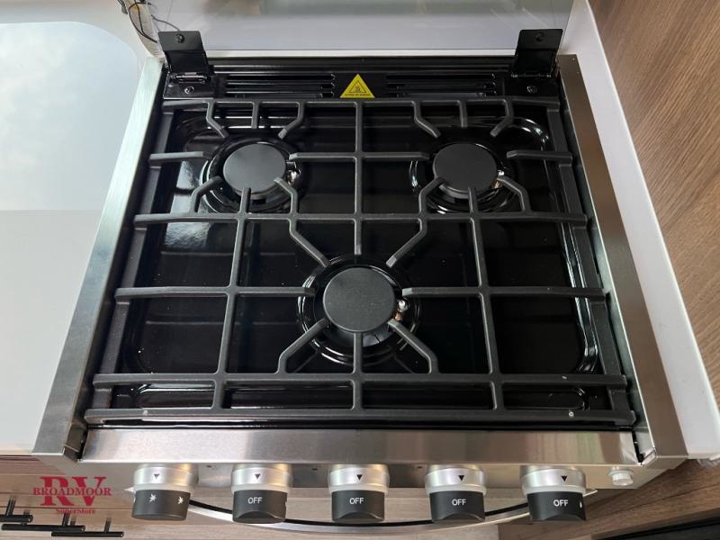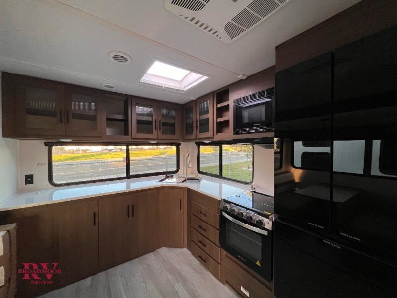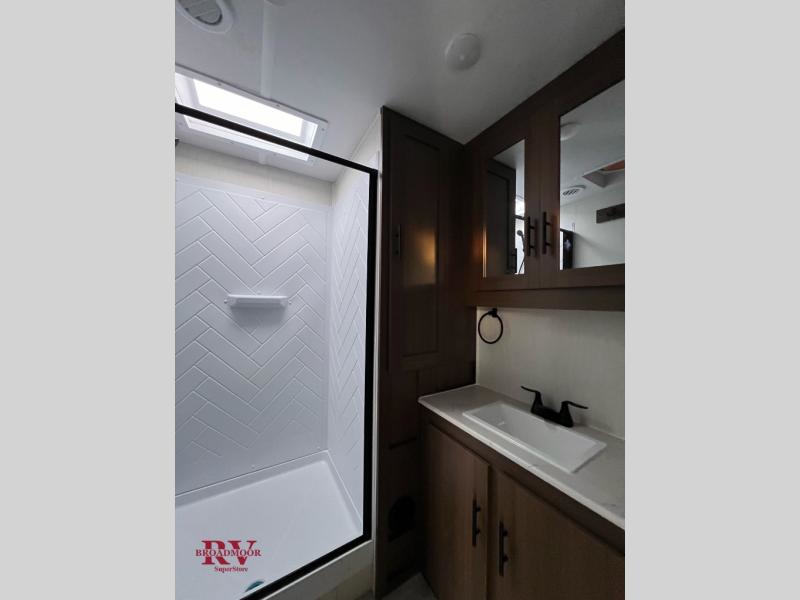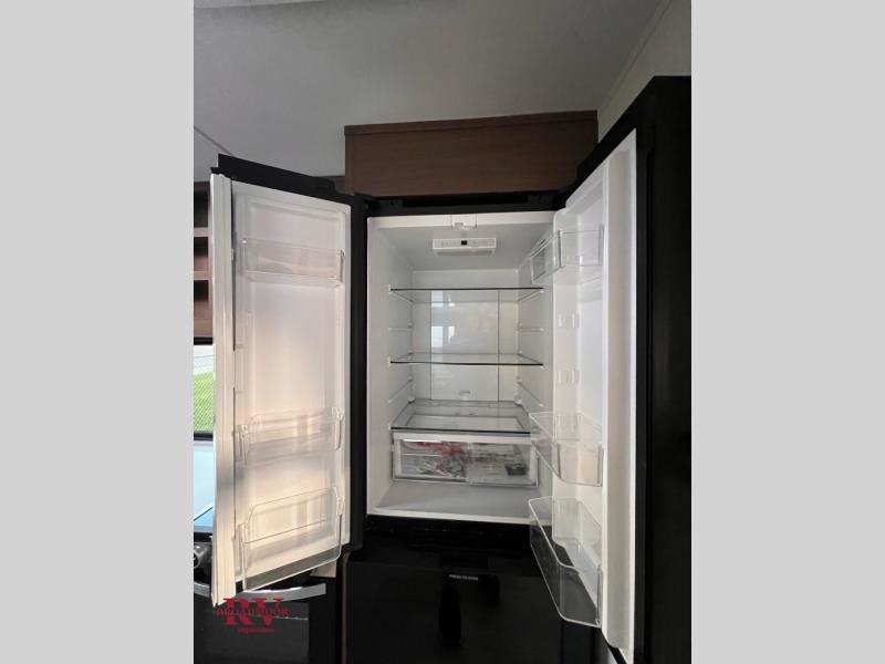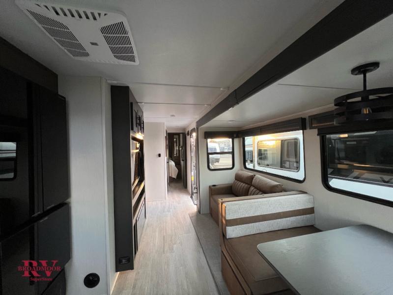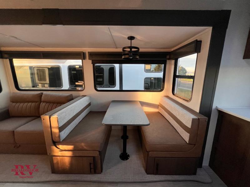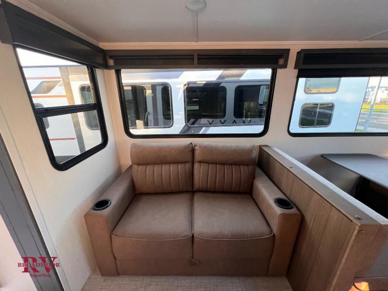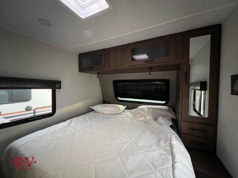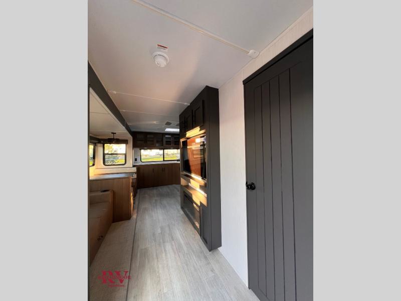 If you enjoy camping with friends and family, but still want your own space at night, this travel trailer is perfect for you! The front private bedroom includes a Maxx king bed, a bedside wardrobe, plus a second wardrobe with two drawers below. Your guest can take the mid-bunkroom that includes Cat-Nap sleepers which is a bunk with fold out mats underneath. There is also a wardrobe with three drawers and a slide out to make this room more spacious. Just outside the bunkroom is the tri-fold hide-a-bed sofa and booth dinette that are in direct view of the smart TV and fireplace. You will also fall in love with the rear kitchen that includes a skylight, plenty of counter space, a large single bowl stainless steel sink, and a 12V refrigerator!