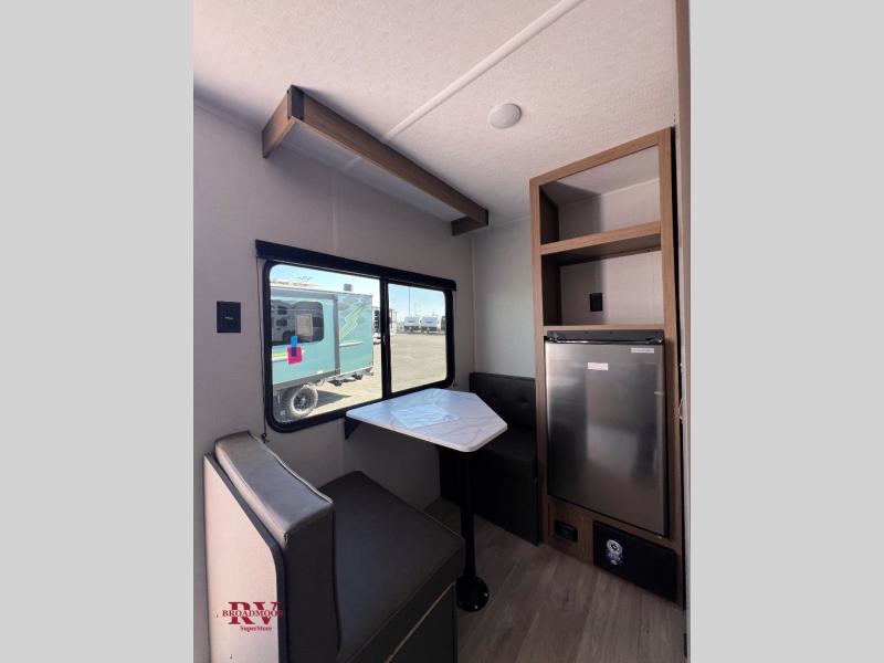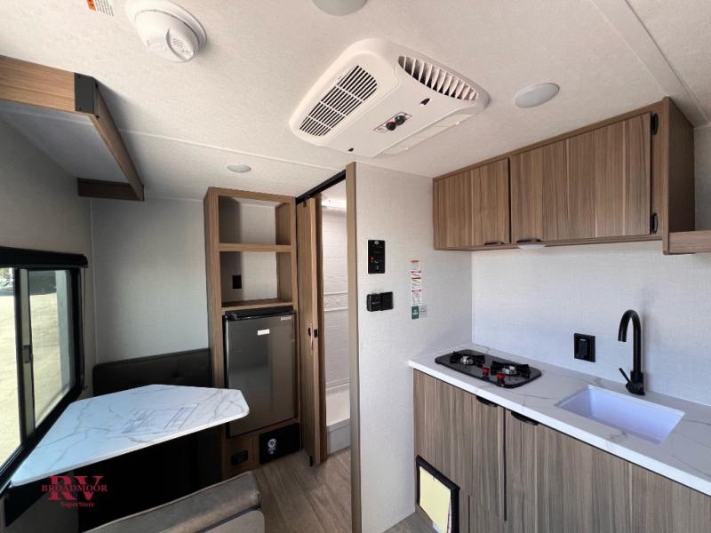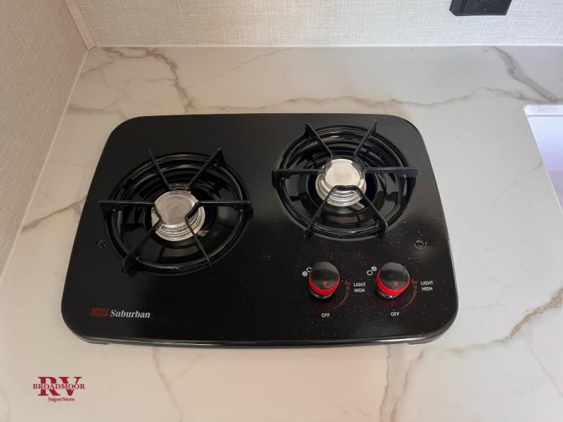 This lightweight travel trailer has everything you need to enjoy camping trips! There is a front east to west custom king bed with storage at the foot of the bed and overhead for your valuables. A private bath includes a toilet and walk-in shower so you can easily get ready each day, and you can prepare your meals on the two-burner cooktop when you get hungry. The booth dinette will provide dining space, along with sleeping space for one to two little ones. Don't let this trailer get away!