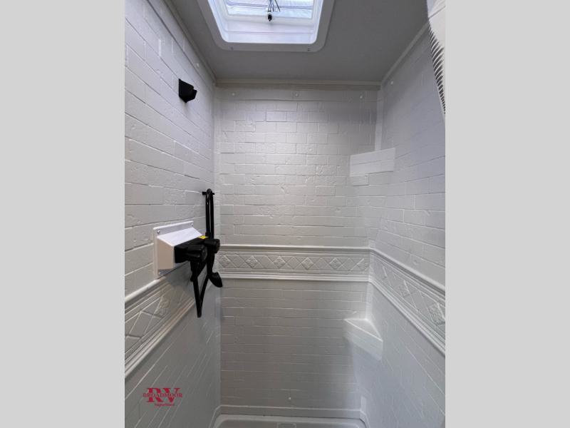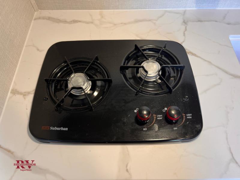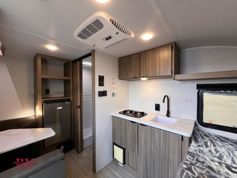 This lightweight travel trailer has everything you need to enjoy camping trips! There is a front east to west custom king bed with storage at the foot of the bed and overhead for your valuables. A private bath includes a toilet and walk-in shower so you can easily get ready each day, and you can prepare your meals on the two-burner cooktop when you get hungry. The booth dinette will provide dining space, along with sleeping space for one to two little ones. Don't let this trailer get away!