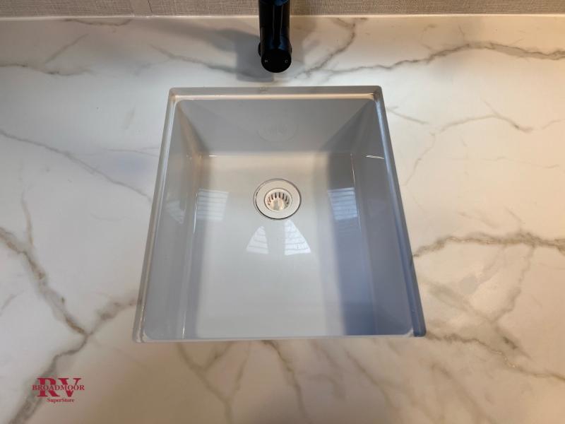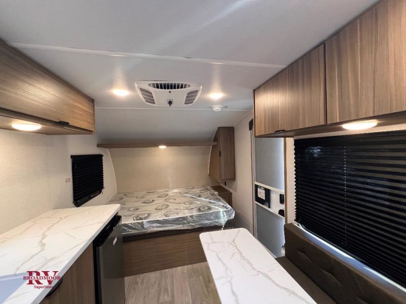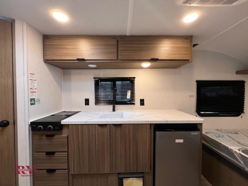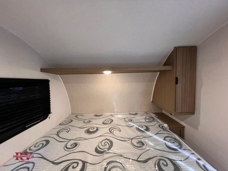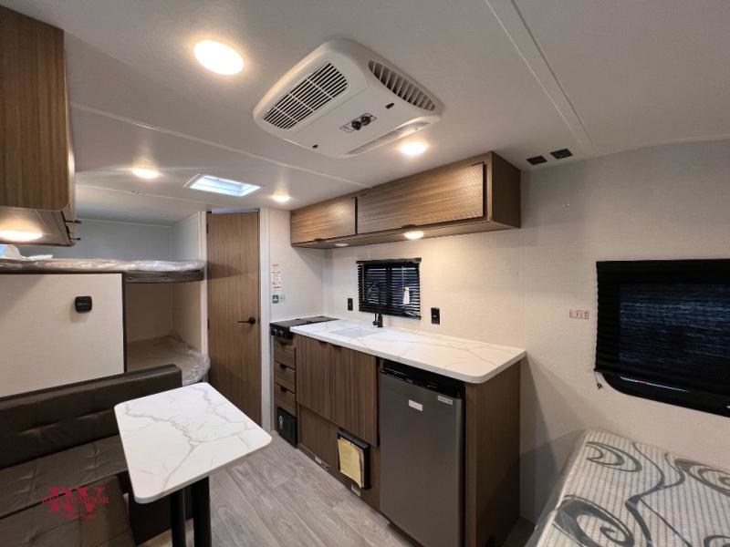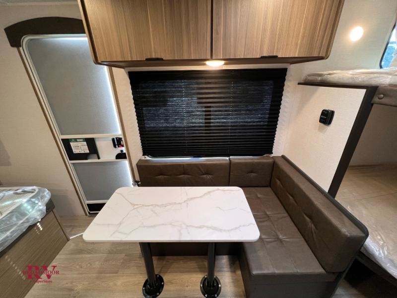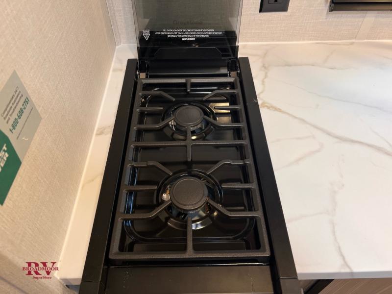 The double-size bunks with storage will be a big selling point in this travel trailer! While your guests take the bunks, you can have the front queen bed all to yourselves, and there is a wardrobe to keep your things organized. A two burner cooktop and microwave will let you make meals each day, and you can dine at the open lounge with a table