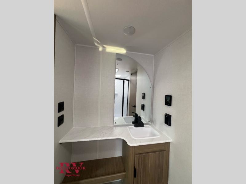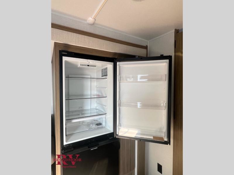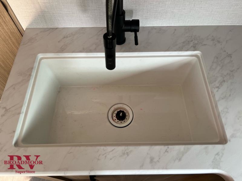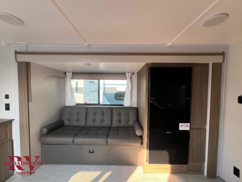 It won't be hard to find comfort in this spacious travel trailer for six! The rear U-shaped dinette includes storage space above and beside it for valuables, and the sofa within the slide out is right across from the fireplace for a cozy evening! There is also generous counter space in the full kitchen, plus an exterior camp kitchen the chef if sure to enjoy. The front master bedroom will have you feeling right at home with a custom king bed, dual wardrobes and nightstands, plus a closet for even more storage space!