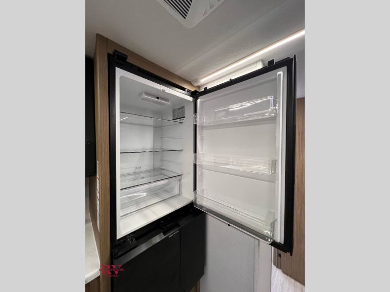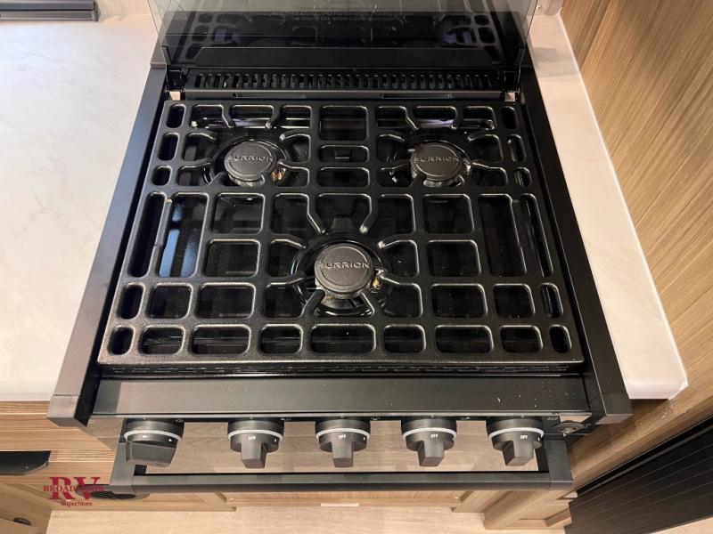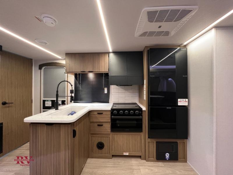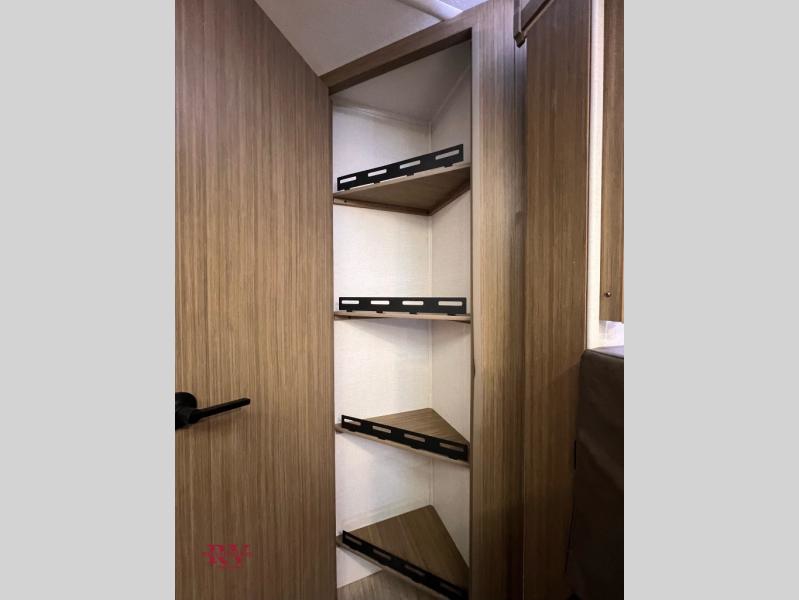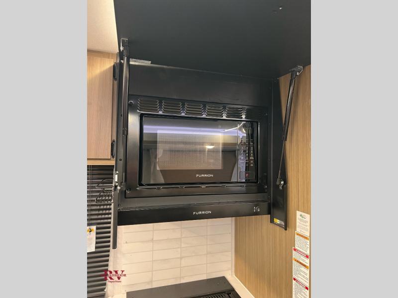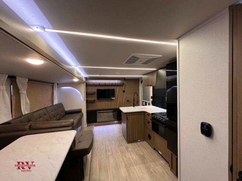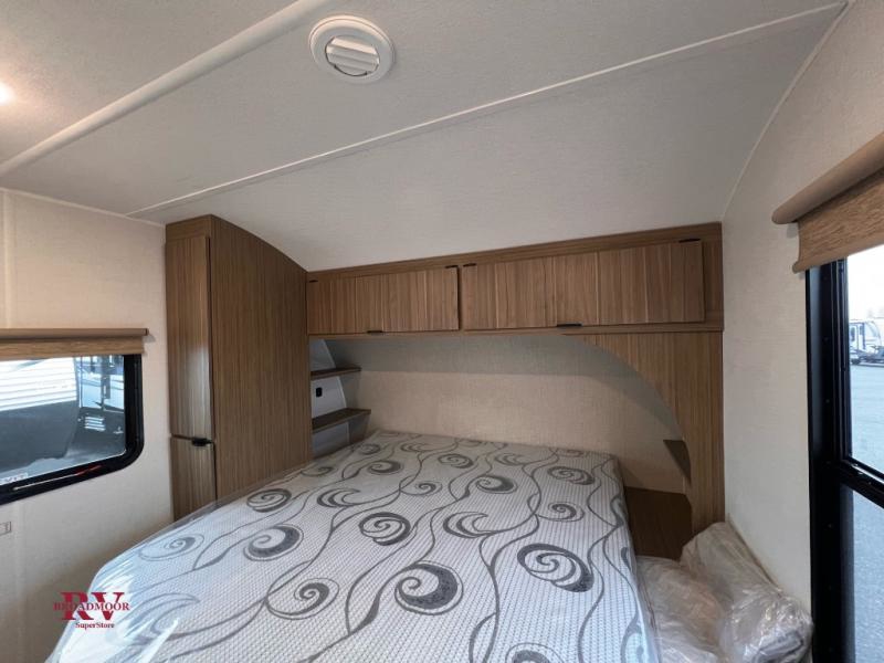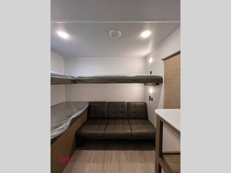 The kids can bring an extra guest or two with this travel trailer! It features a rear private bunkhouse with a set of bunk beds and a fold-up bunk above a Jiffy sofa. Just outside the bunkhouse is a pantry big enough to store your canned goods and a full bathroom to rinse off your fun-filled day. The kitchen is just waiting for you to create a delicious home cooked meal with a cooktop and a 12V refrigerator to store any leftovers in after eating at the Versa U-dinette. There is a pass-through storage area to hold all of your outdoor camping gear, a 16' awning to protect you, and an exterior camp kitchen for a sunrise breakfast!