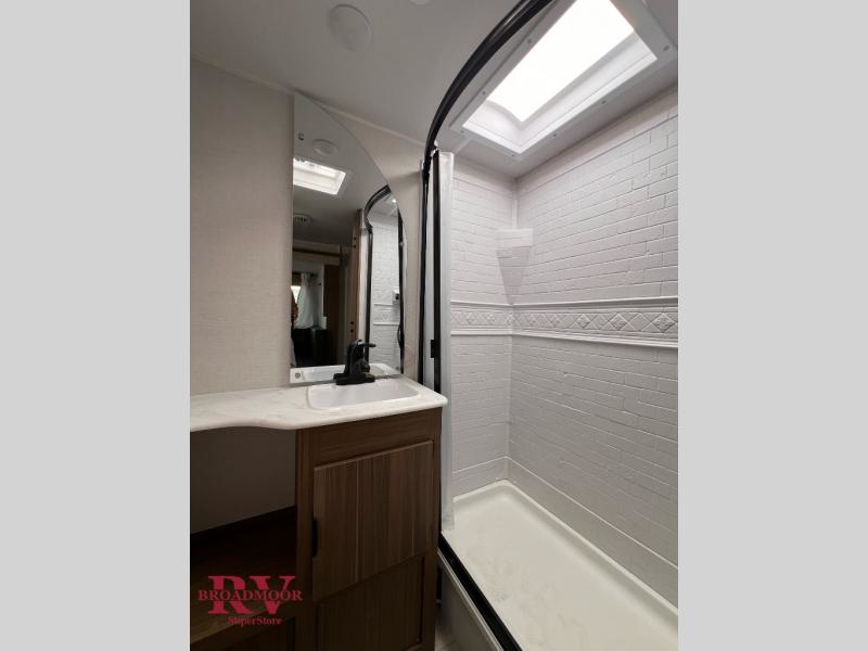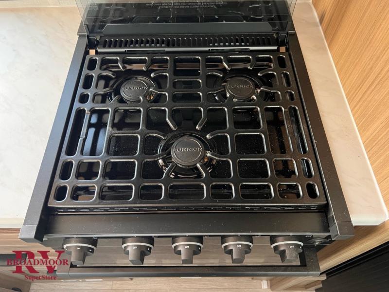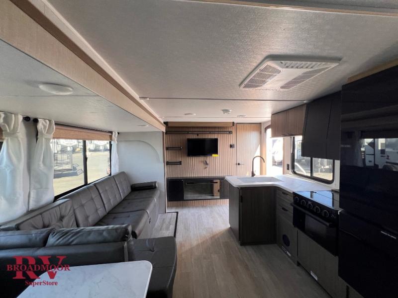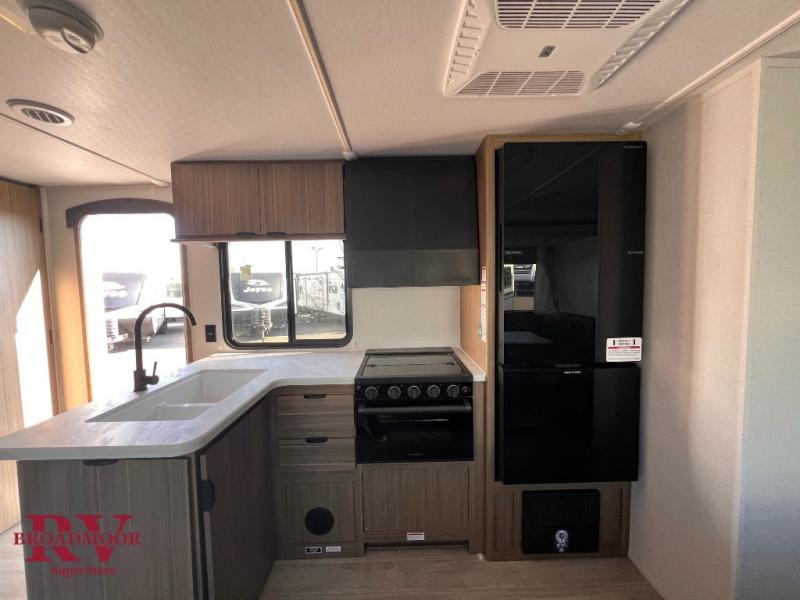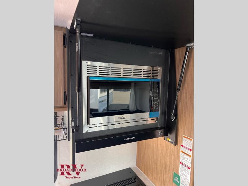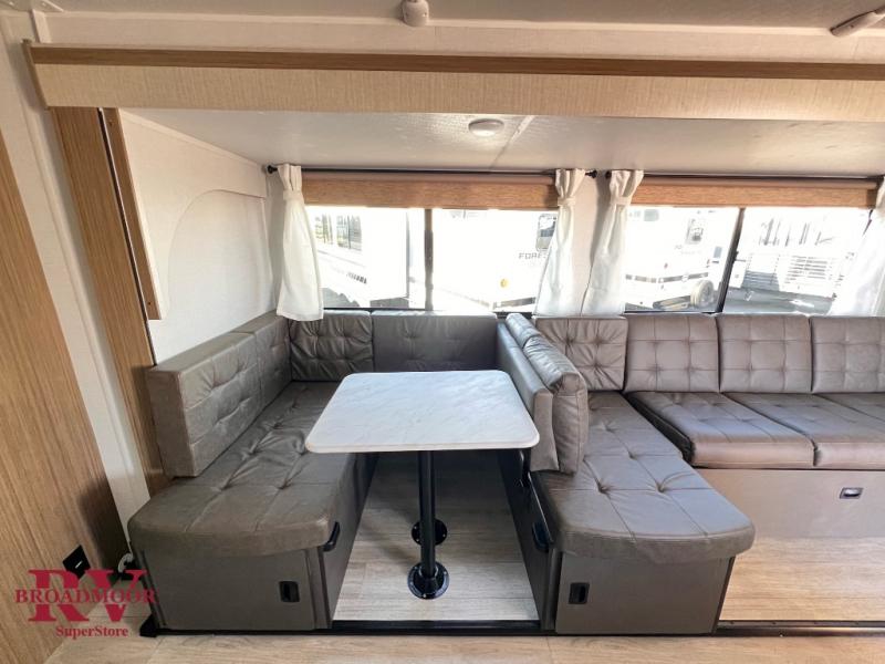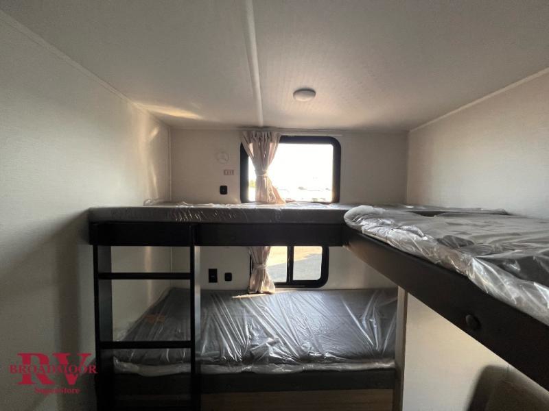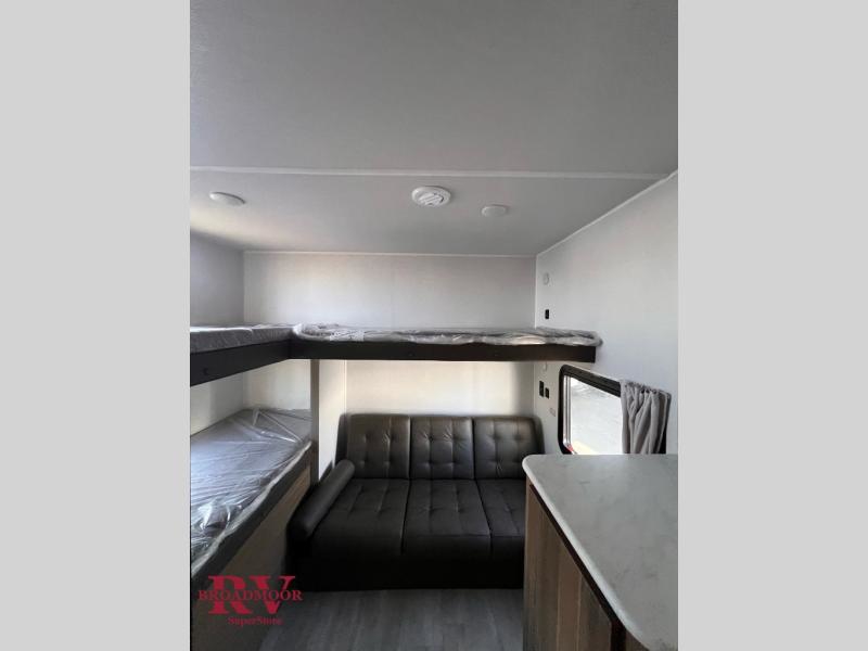 The kids can bring an extra guest or two with this travel trailer! It features a rear private bunkhouse with a set of bunk beds and a fold-up bunk above a Jiffy sofa. Just outside the bunkhouse is a pantry big enough to store your canned goods and a full bathroom to rinse off your fun-filled day. The kitchen is just waiting for you to create a delicious home cooked meal with a cooktop and a 12V refrigerator to store any leftovers in after eating at the Versa U-dinette. There is a pass-through storage area to hold all of your outdoor camping gear, a 16' awning to protect you, and an exterior camp kitchen for a sunrise breakfast!