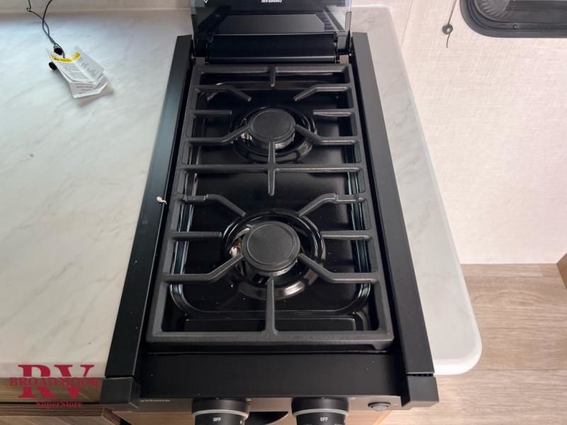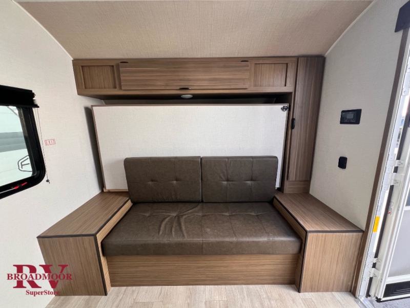 Comfort and convenience will be found in this travel trailer! From the set of double bed bunks to the front Murphy bed that offers sofa seating during the day and a queen bed to sleep on at night. Everyone can freshen up in the rear corner bathroom with the shower. The kitchen has everything you need to prepare your best home cooked meals and you can enjoy them at the booth dinette with a window to look out at your beautiful scenery. There is even an outside kitchen with a griddle and mini fridge so you can cook in the great outdoors. With an exterior full pass-through storage area, you can bring all of your outdoor gear!