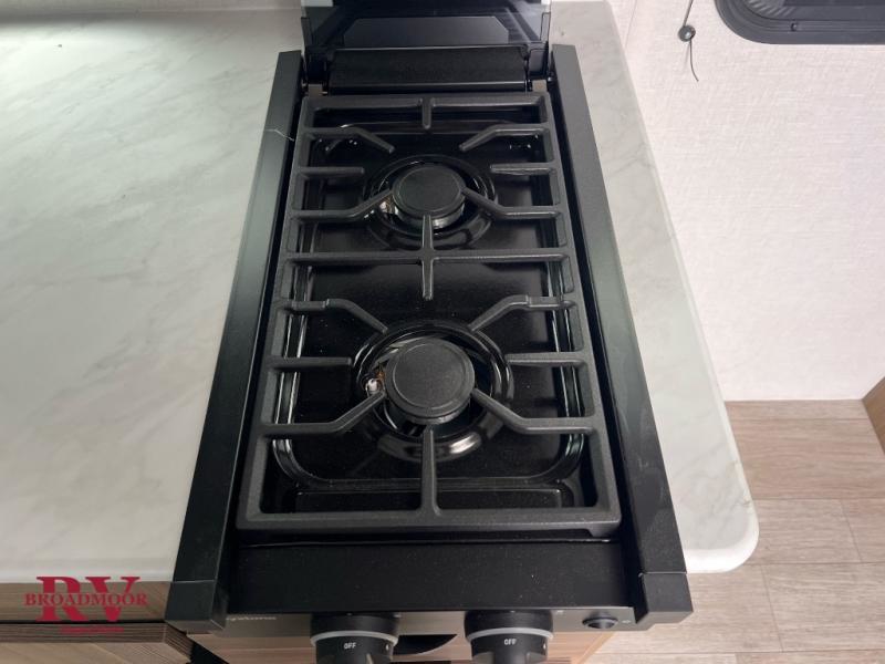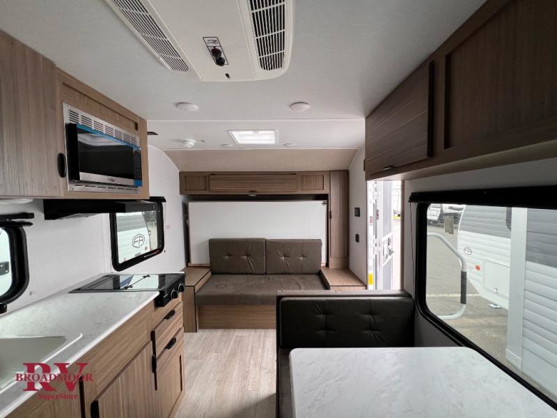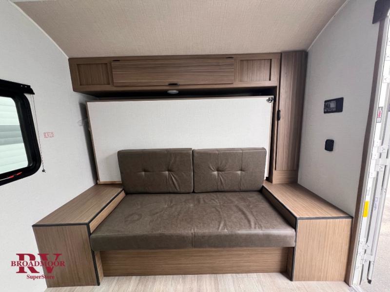 Comfort and convenience will be found in this travel trailer! From the set of double bed bunks to the front Murphy bed that offers sofa seating during the day and a queen bed to sleep on at night. Everyone can freshen up in the rear corner bathroom with the shower. The kitchen has everything you need to prepare your best home cooked meals and you can enjoy them at the booth dinette with a window to look out at your beautiful scenery. There is even an outside kitchen with a griddle and mini fridge so you can cook in the great outdoors. With an exterior full pass-through storage area, you can bring all of your outdoor gear!