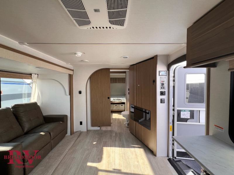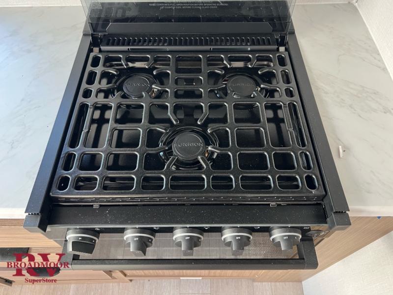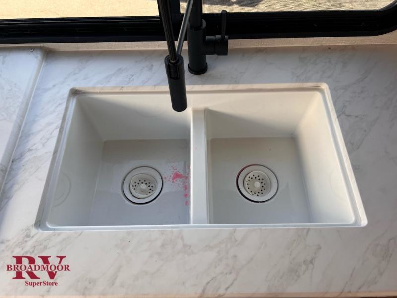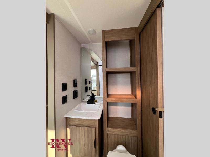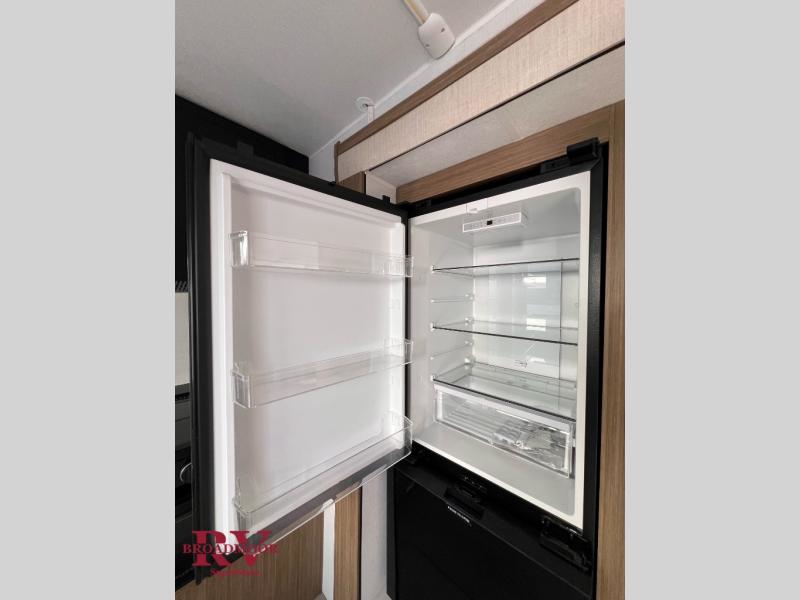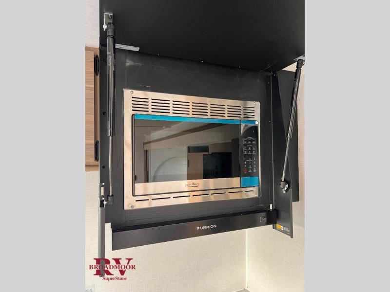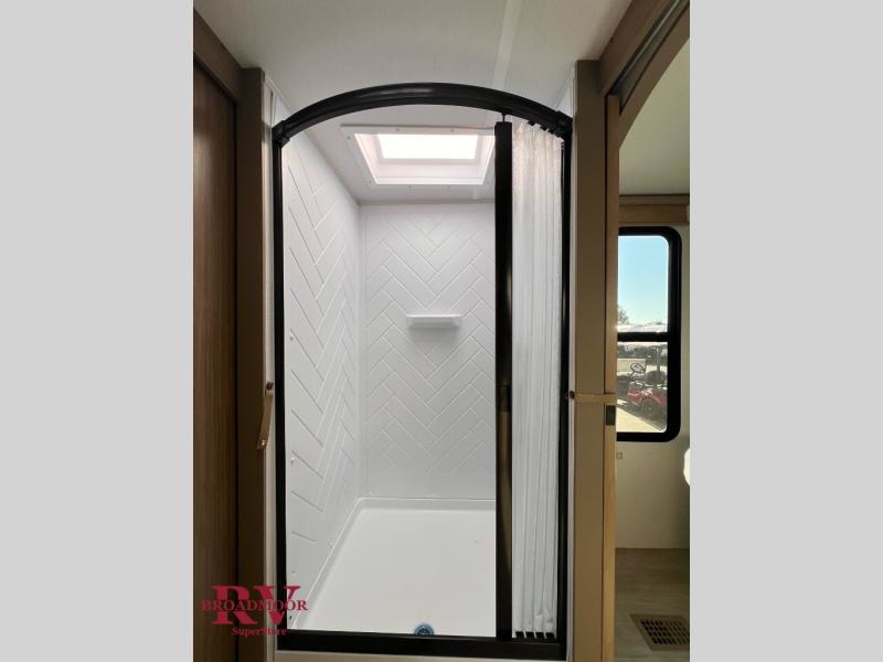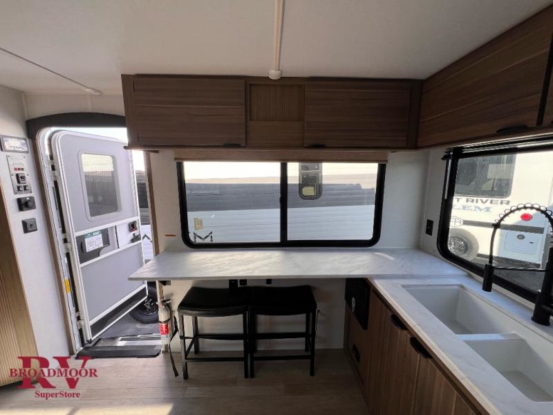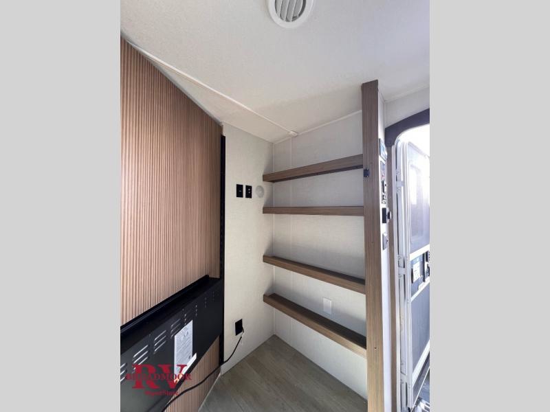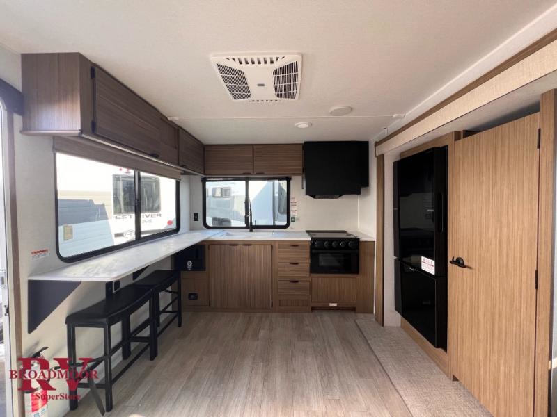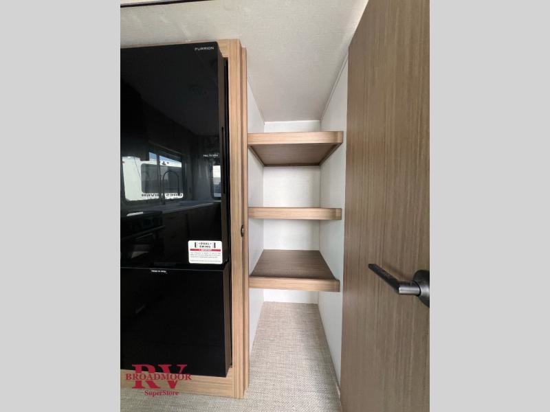 You're going to love cooking in the rear kitchen of this travel trailer! It has everything you need to prepare delicious home cooked meals including a large pantry and oversized fridge, plus there are two bar stools to sit on while you enjoy them. The theater seating is conveniently across from the swiveling entertainment center which has hidden shelves behind it for your games and movies. As you walk through the bathroom, you will notice a walk-in shower to the left and a toilet and sink to the right. It leads directly into the front private bedroom which has a Versa-Tilt custom king bed to lay your head on at night and a closet plus overhead storage for your items!