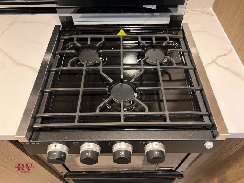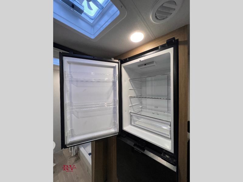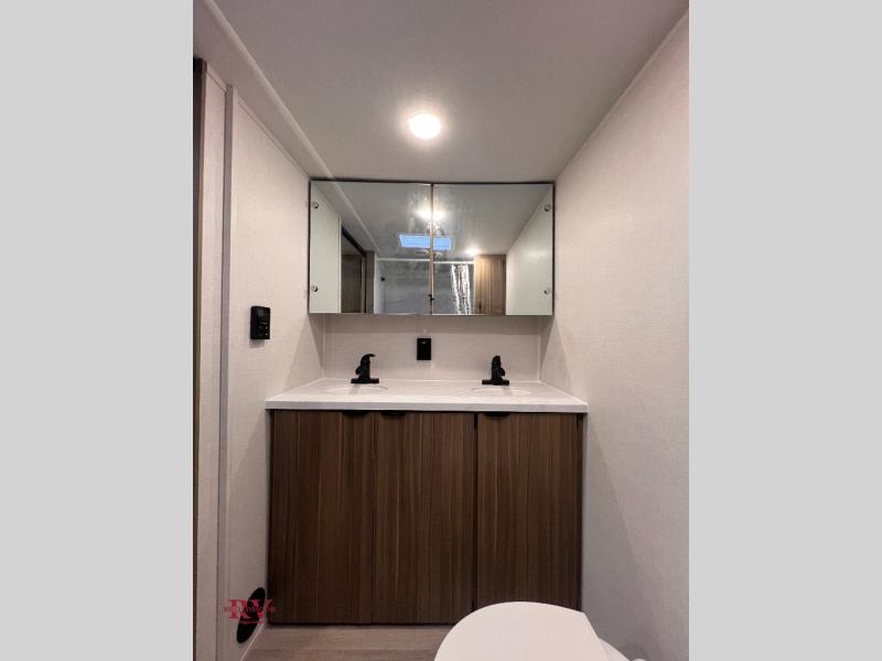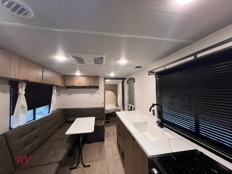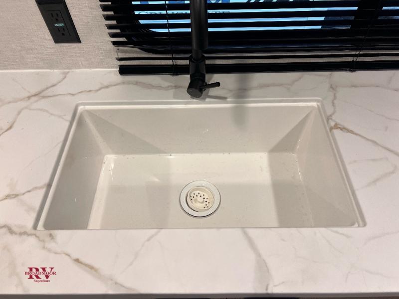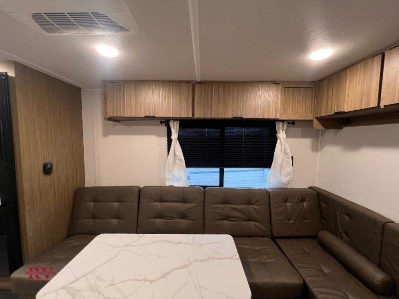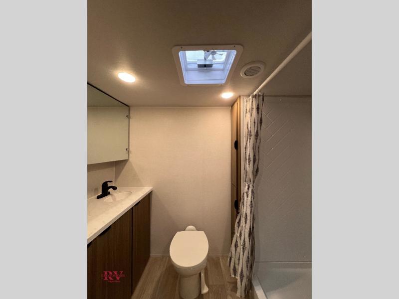 Camping is made easy in this travel trailer with at-home comforts! You'll have the front private bedroom with a king bed all to yourselves, and there are dual bedroom wardrobes to keep your space neat and clean. Any additional guests can sleep on the super lounge with a removable table. You will appreciate the full rear bath complete with a linen closet and dual bath sinks so you both can get ready for bed at once. And a full kitchen lets you whip up your best meals!