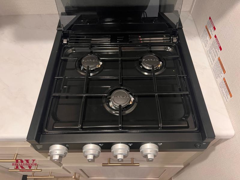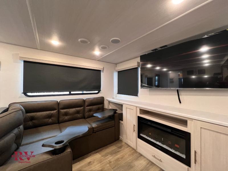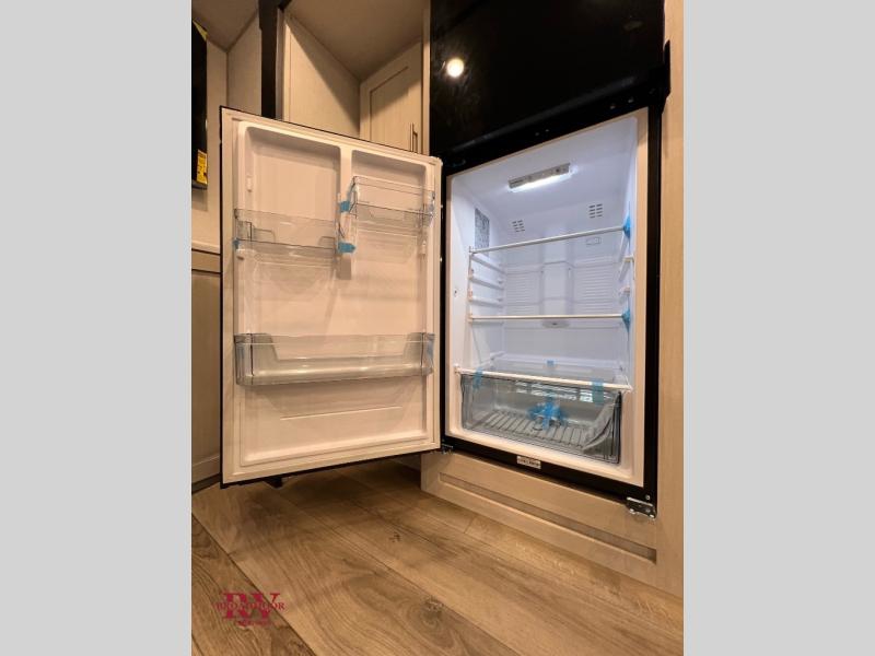 The inviting and sophisticated living area has a cutting-edge entertainment center that provides a focal point for relaxation and enjoyment, perfect for streaming favorite series or high-definition movies. The sofa offers comfortable seating for unwinding and socializing in a warm ambiance. Plus, the pull-out ottoman adds versatile seating and extra comfort for guests or moments of deep relaxation. In the kitchen area, you will have a spacious refrigerator, a pantry, a bar countertop with two chairs, overhead cabinets for better organization, and an air fryer/microwave that fuses functionality for quick and healthy meal preparation. The convenient walk-through bathroom will be your best ally when you want to take a shower after a long day in the mountains, and the front bedroom will be a great, serene retreat to have a good night's sleep.