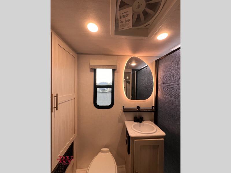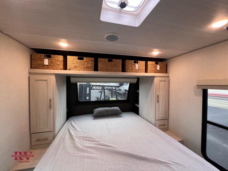 The rear bathroom with a linen closet is for personal care and storage of linens, a front bedroom with a king bed and two wardrobes, creates a serene retreat with ample storage for clothing and personal items, perfect for restful nights. The theater seating provides immersive comfort for relaxation and entertainment, ideal for enjoying movies or unwinding after a day of exploration. Overhead cabinets deliver additional storage for travel essentials and keepsakes. The kitchen area boasts a fridge, a pantry, an air fryer/microwave that combines versatility for quick and healthy meal preparation, a countertop extension, and a flip-up window that enhances ventilation and brings in natural light for a bright kitchen ambiance. You can also enjoy the outdoor living delights by cooking in the incredible outlook kitchen un ther the protection of the power awning.