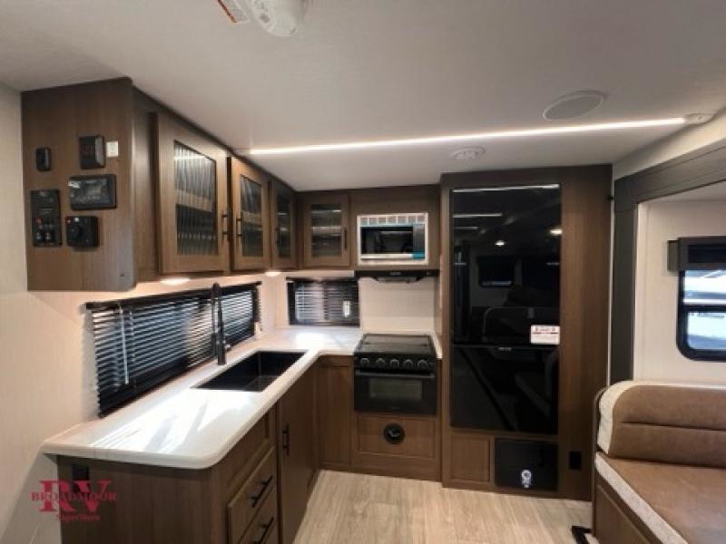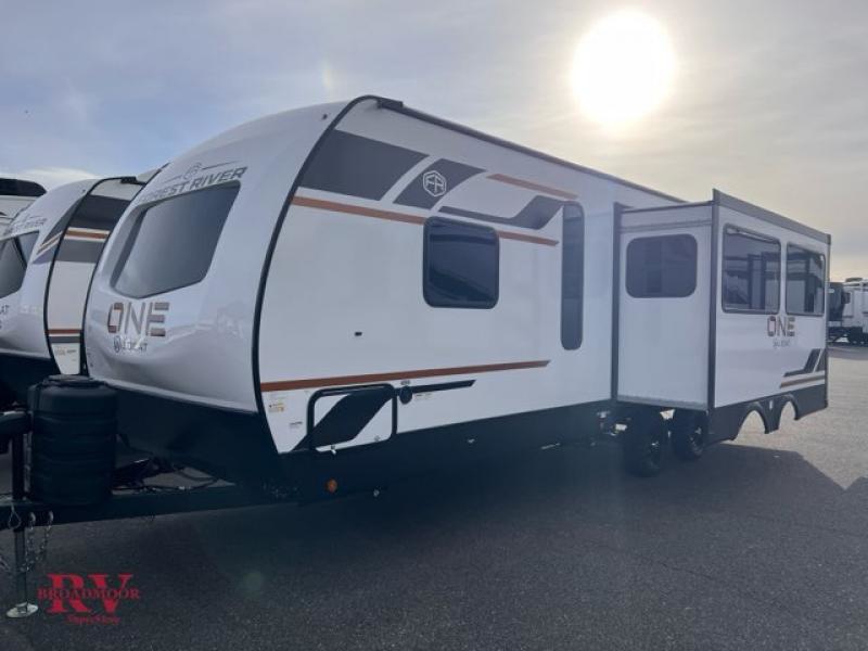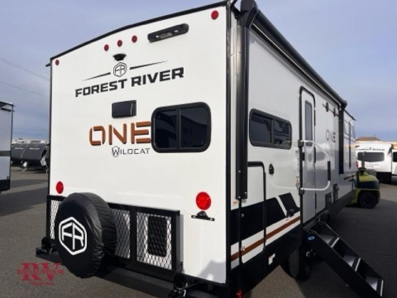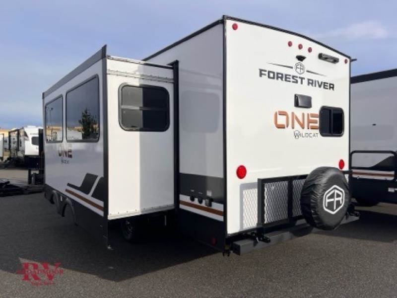 With any Wildcat ONE travel trailer by Forest River in tow, you will find fun and adventure wherever you go! Each model is constructed 2" thick Vacuum-Bonded sidewalls, a Maxx-strength aluminum-framed laminated floor, and double R-7 fiberglass insulation for added protection. These features are included with the Maxx Insulation Package, which also includes slam-latch baggage doors, a fully enclosed underbelly, and more. The Dynamic Technology Package features a 200W expandable roof mounted solar panel with a 30 amp charge controller for off-grid capabilities, backup camera prep, an exterior TV connection, and a frame-mounted receiver hitch to name a few conveniences. A front windshield is found within the Peak Package, along with a power tongue jack, solid surface kitchen countertops, friction hinge entry doors, and an exterior ladder prep.