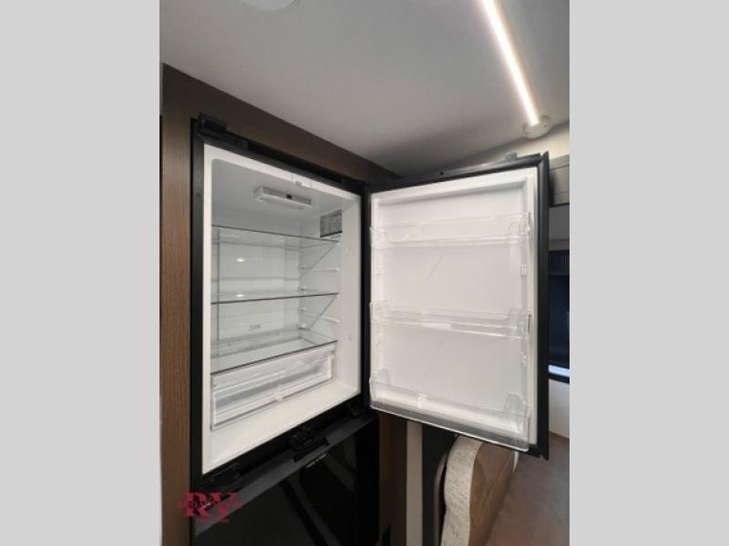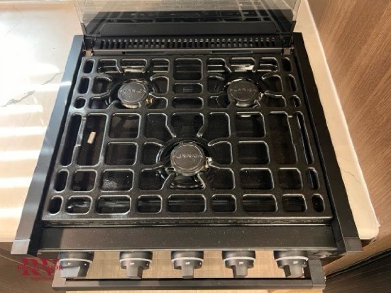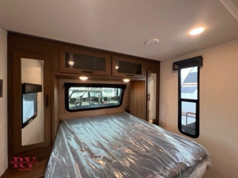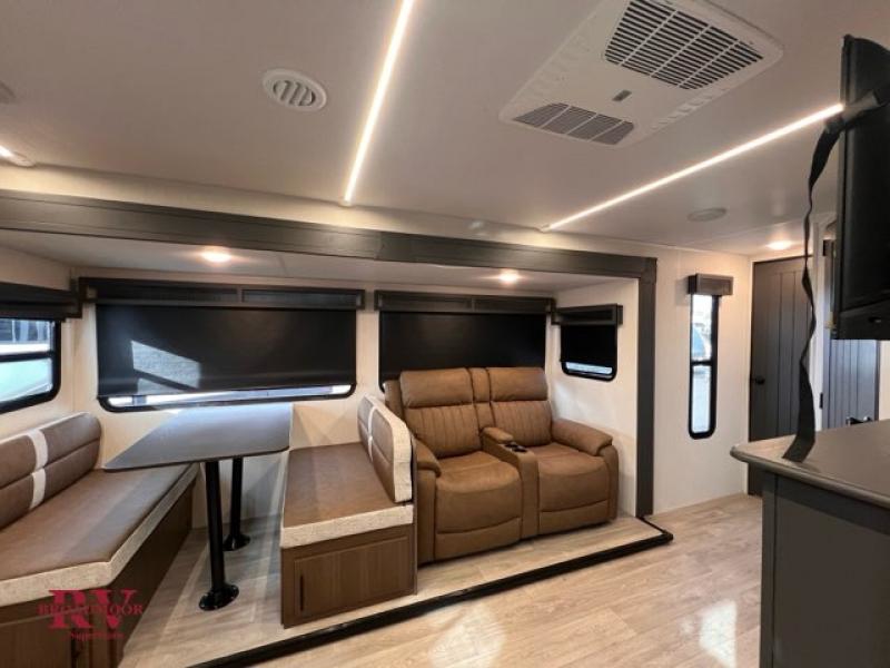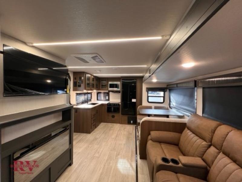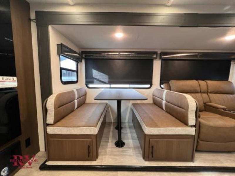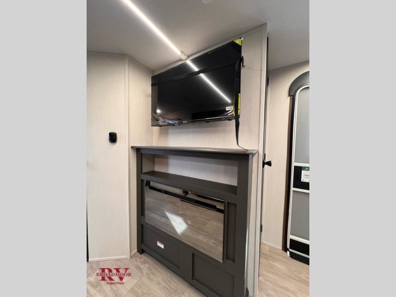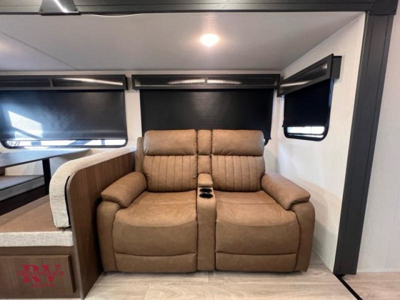 Prepare delicious meals and snacks with ease inside or outside of the RV, and enjoy quality time with loved ones! The rear kitchen is a culinary haven, featuring ample counter space, a walk-in pantry with shelves, and an outside kitchen for alfresco dining. The booth dinette is a charming spot for meals and conversation, perfect for sharing stories and making memories. Relax and unwind with family and friends, or enjoy a quiet evening in the spacious living area. The entertainment center is the heart of the trailer, featuring a fireplace that creates a warm and inviting ambiance. The trifold sofa provides additional seating and sleeping space, perfect for lounging and socializing. The front bedroom is a romantic retreat, featuring a queen bed, nightstands, and spacious wardrobes.