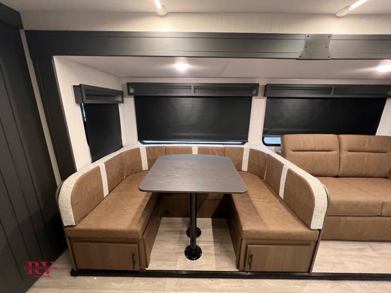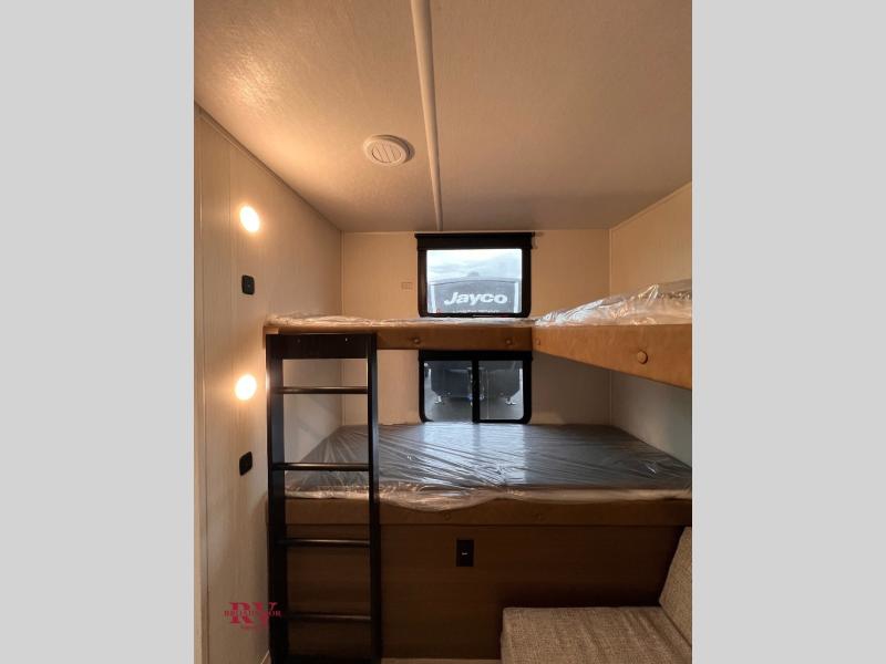 The rear bunk room is a haven for kids, featuring bunk beds, a sofa, and a spacious wardrobe. It's the perfect spot for little ones to sleep, play, and have fun. The full bathroom is a refreshing oasis, with a practical layout and all the essentials for a comfortable stay. The well-equipped kitchen is a culinary dream, with a U-dinette that's perfect for family meals and morning coffee. The living area is a warm and inviting space, featuring a tri-fold sofa bed, entertainment center, and fireplace. It's the perfect spot to relax, unwind, and make memories with family and friends. The front bedroom is a peaceful retreat, with a queen bed, nightstand, and spacious wardrobes.