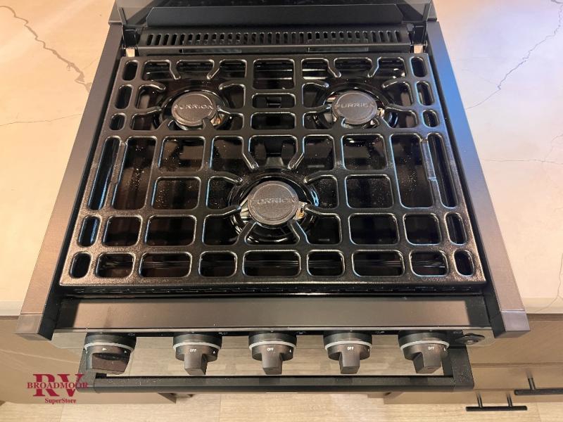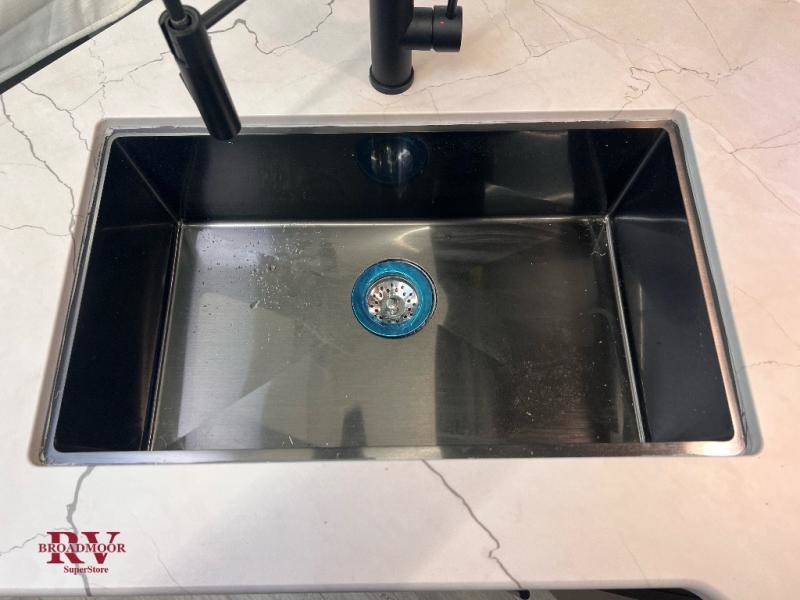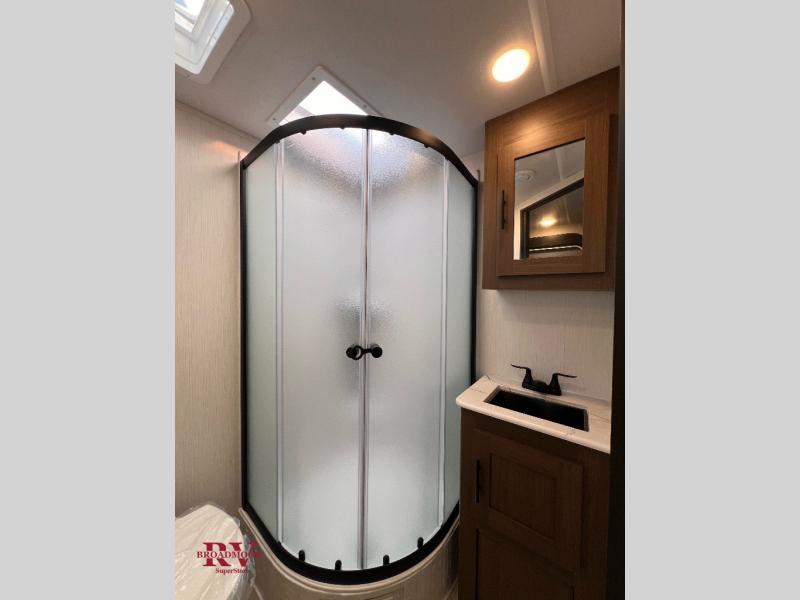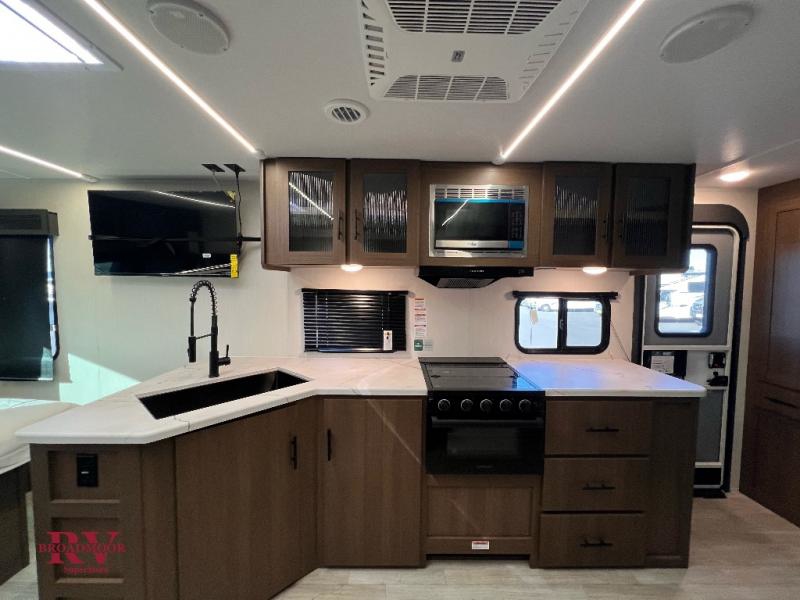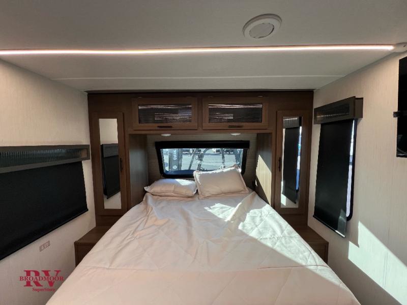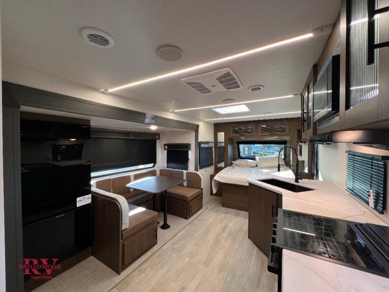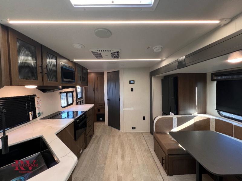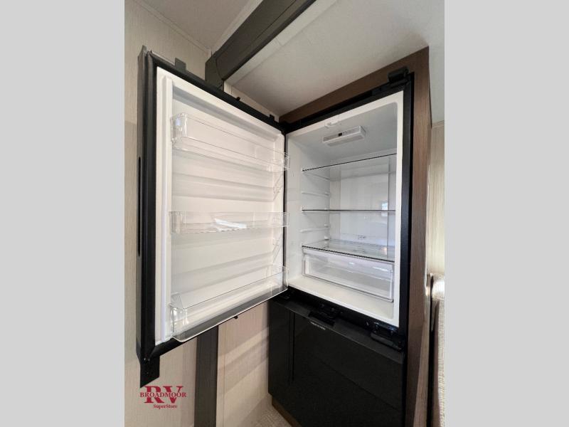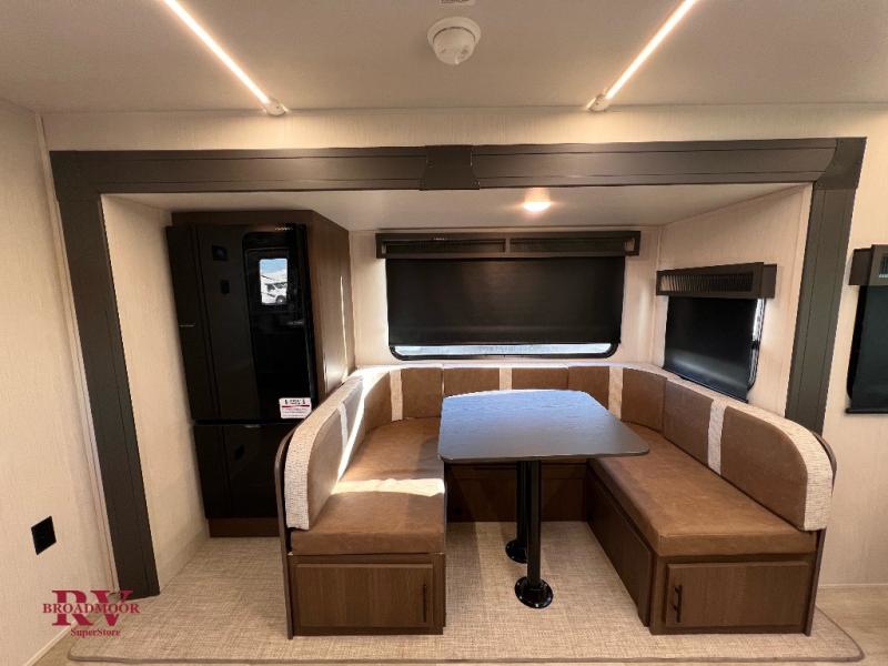 Drift off to sleep feeling relaxed and rejuvenated. The queen bed is a tranquil retreat, complete with nightstands and a spacious wardrobe! The full bathroom is a serene oasis, featuring a radius shower and ample storage. Unwind and recharge in style. The kitchen is equipped with a 12V refrigerator, pantry, and overhead cabinets, providing ample space for meal prep and storage. The U-dinette is a cozy haven for meals and conversation, perfect for sharing stories and making memories.